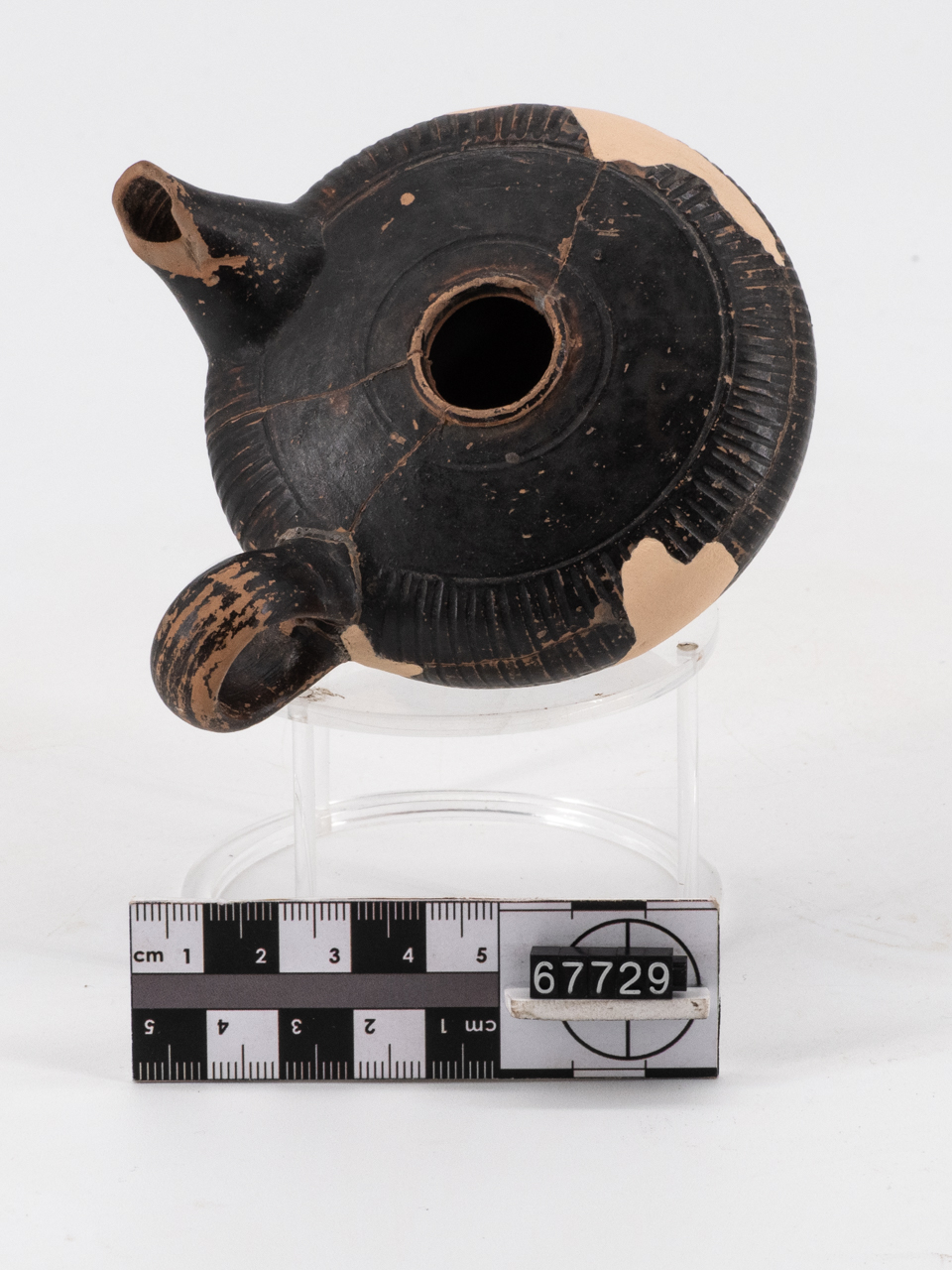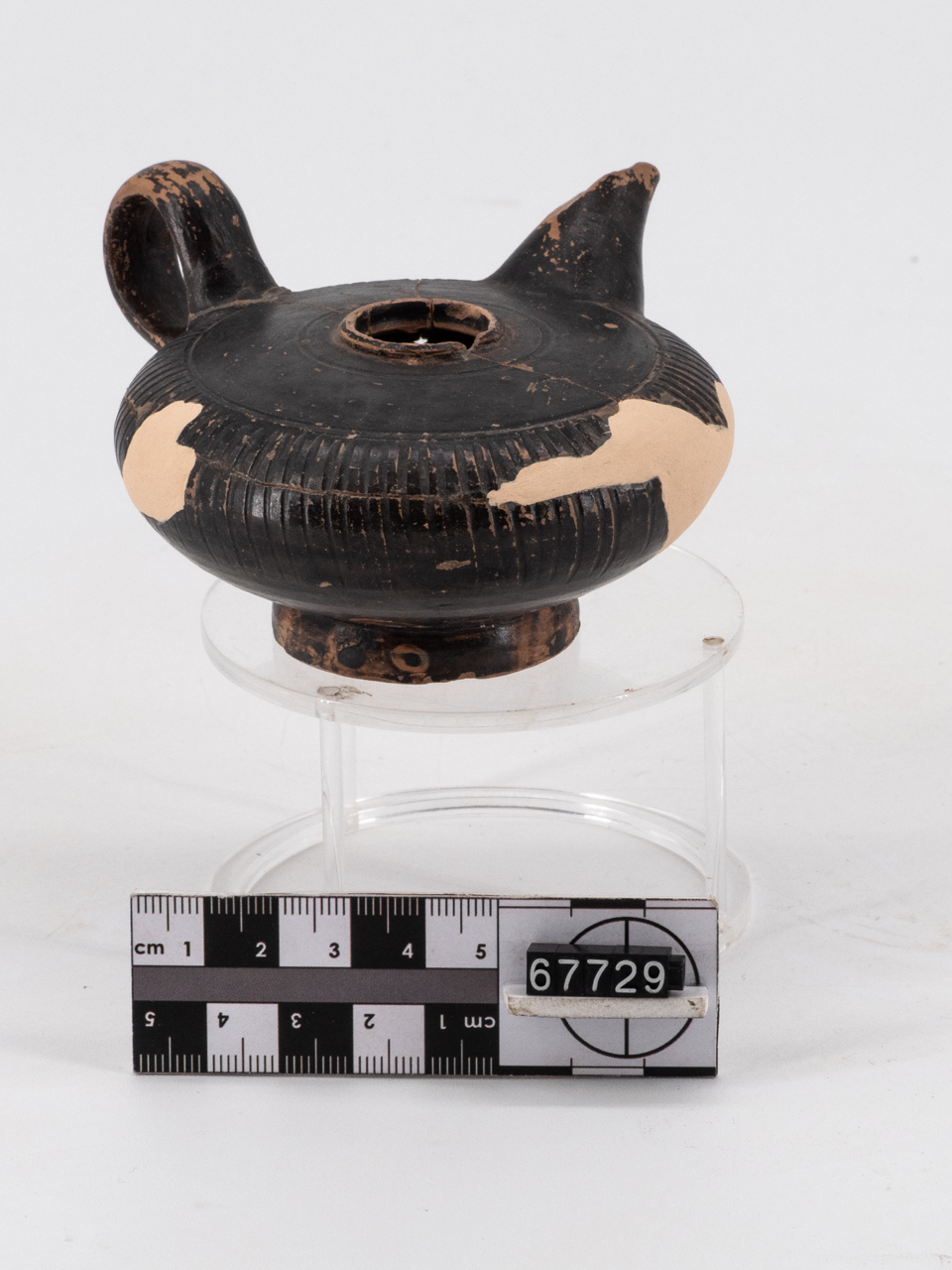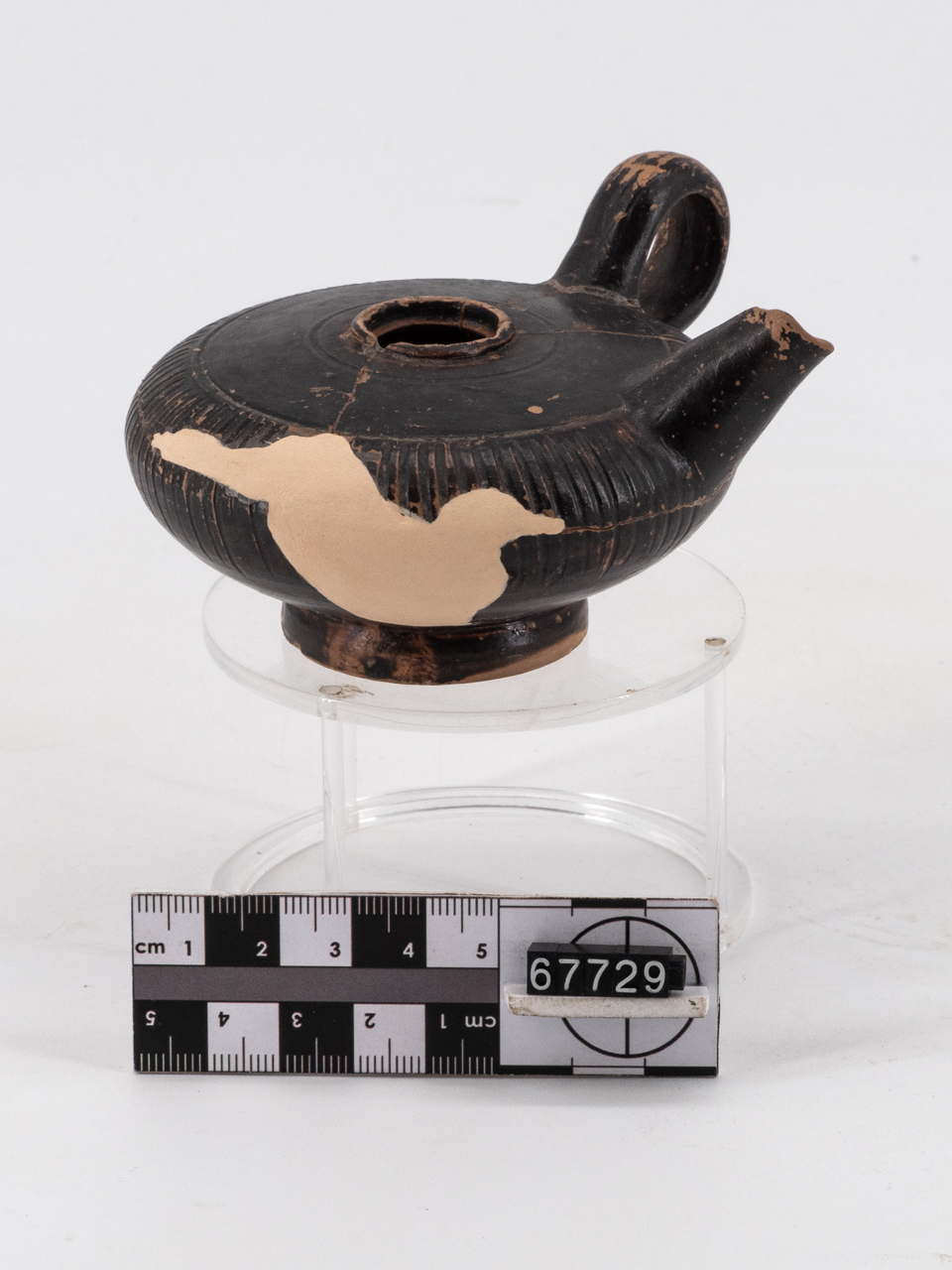 Corpo lenticolare, piede cilindrico, ansa e beccuccio impostati sulla spalla