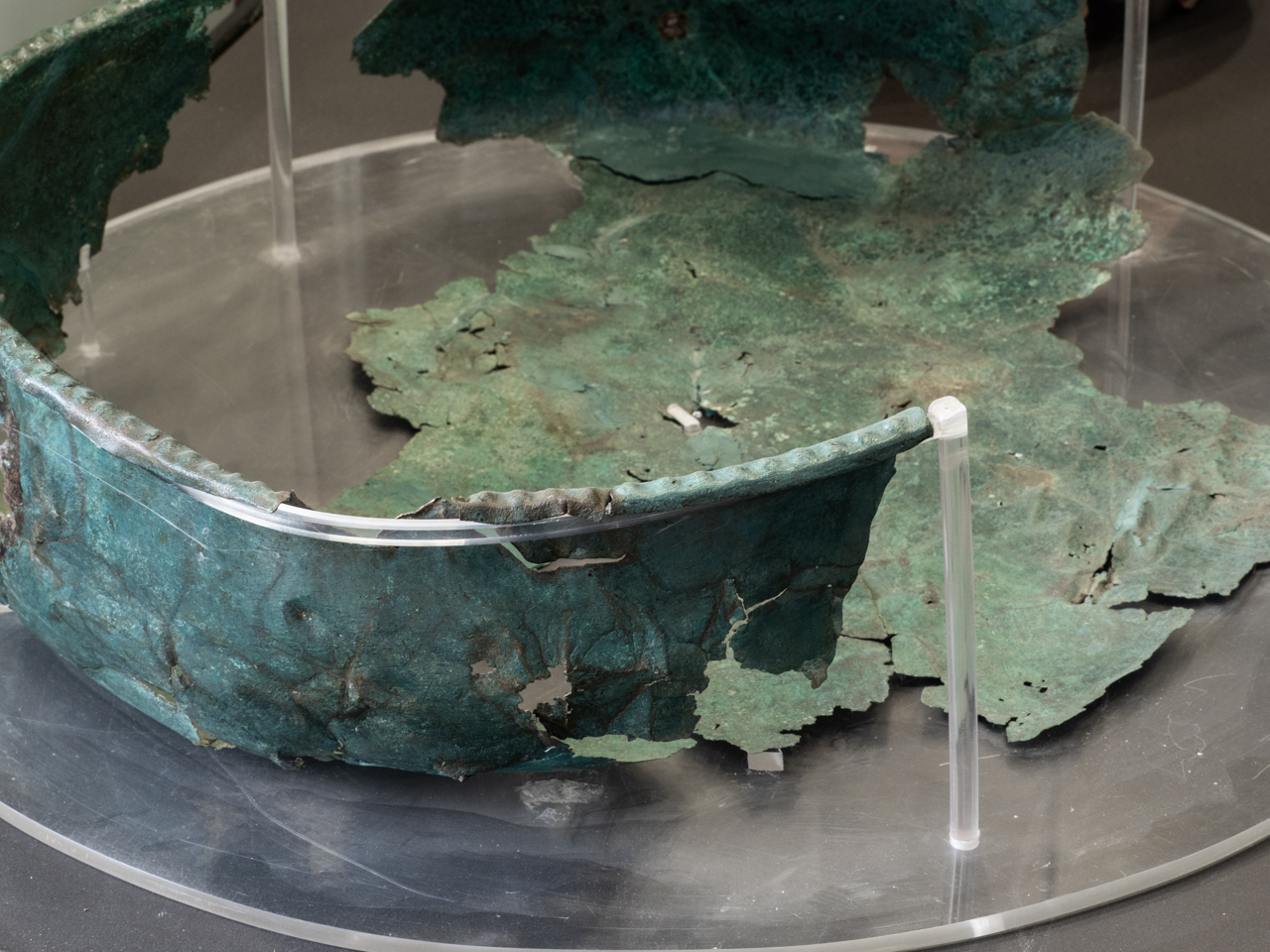 Bacile in bronzo, con vasca profonda e concava, orlo perlinato e tre piedi in ferro saldati