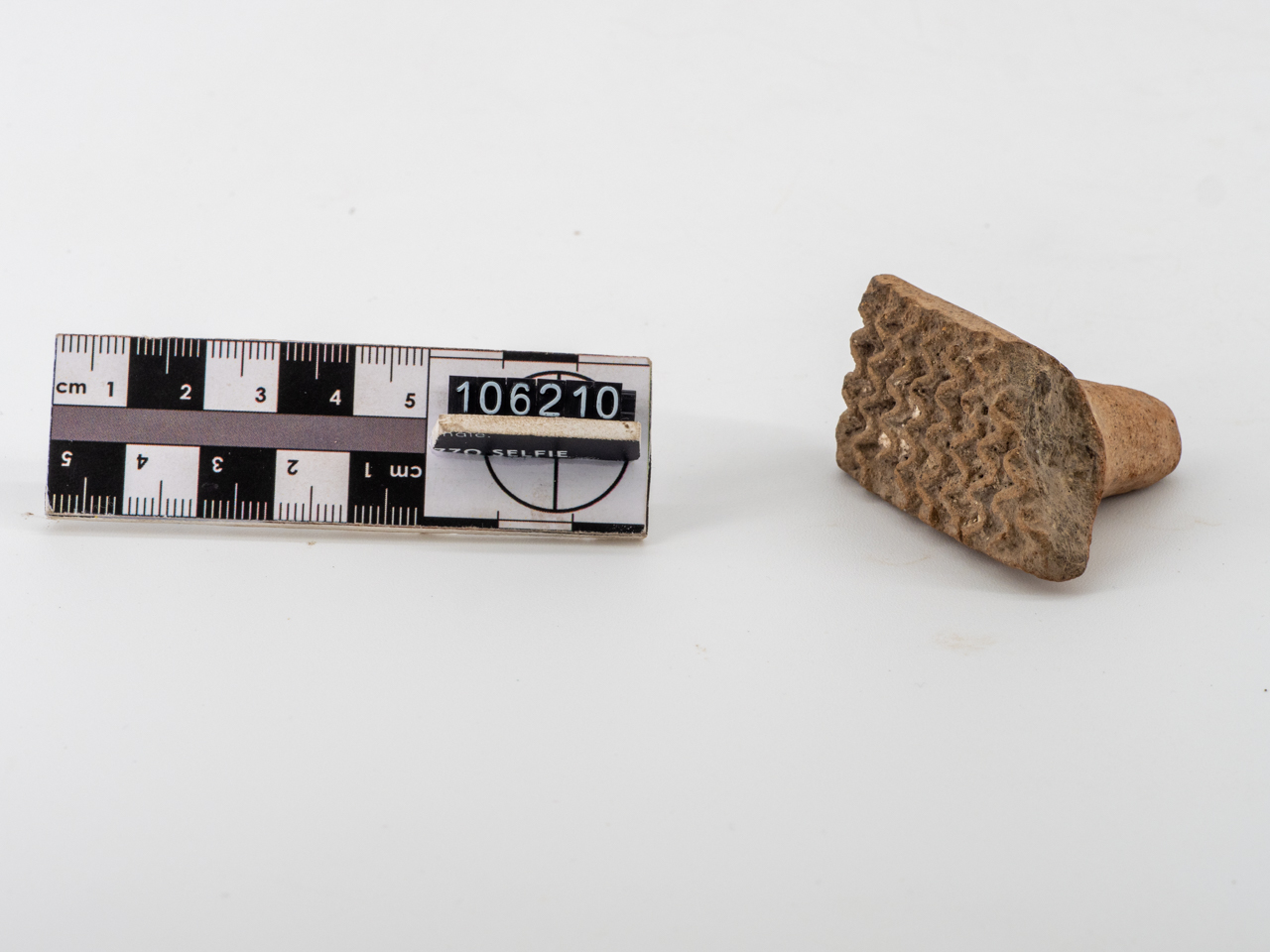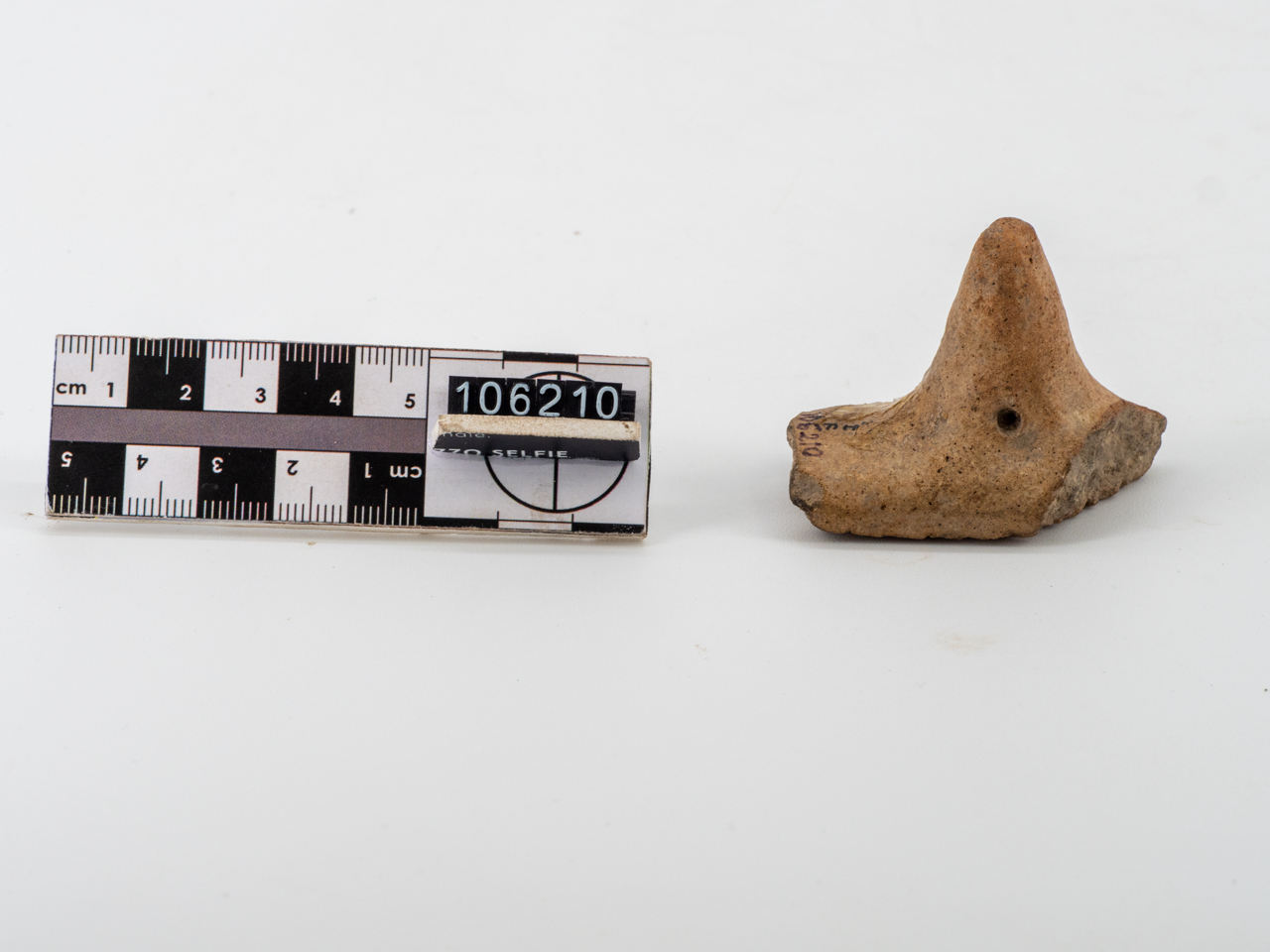 Stampo pintadera in impasto brunastro; presa a punta con foro passante; lacunoso dello stampo nella base