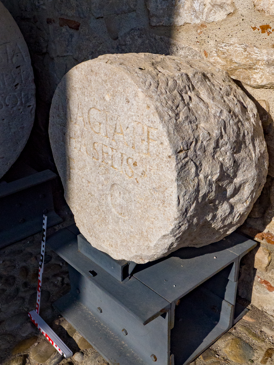 Cippo funerario di forma cilindrica con iscrizione sulla faccia superiore con caratteri nitidi e regolari. Il cippo doveva essere infisso nel terreno sulla fronte di un più ampio monumento funerario