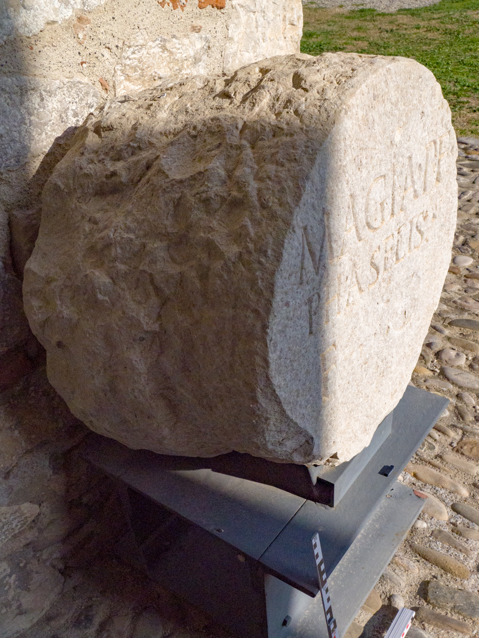 - NOTIZIE STORICO CRITICHE Il cippo è una parte di un più grande monumento funerario i cui altri frammenti sono irreperibili. Il monumento comprendeva tre grandi lastroni connessi ad un'imponente sepoltura; due di essi erano combacianti e presentavano un'apertura arcuata verso il basso, così da far supporre che inquadrassero l'arco superiore della porta dell'edificio funerario. Il monumento era dedicato P. Magius Philo e a Norbana Pyrallis da parte della figlia Magia Phaselis