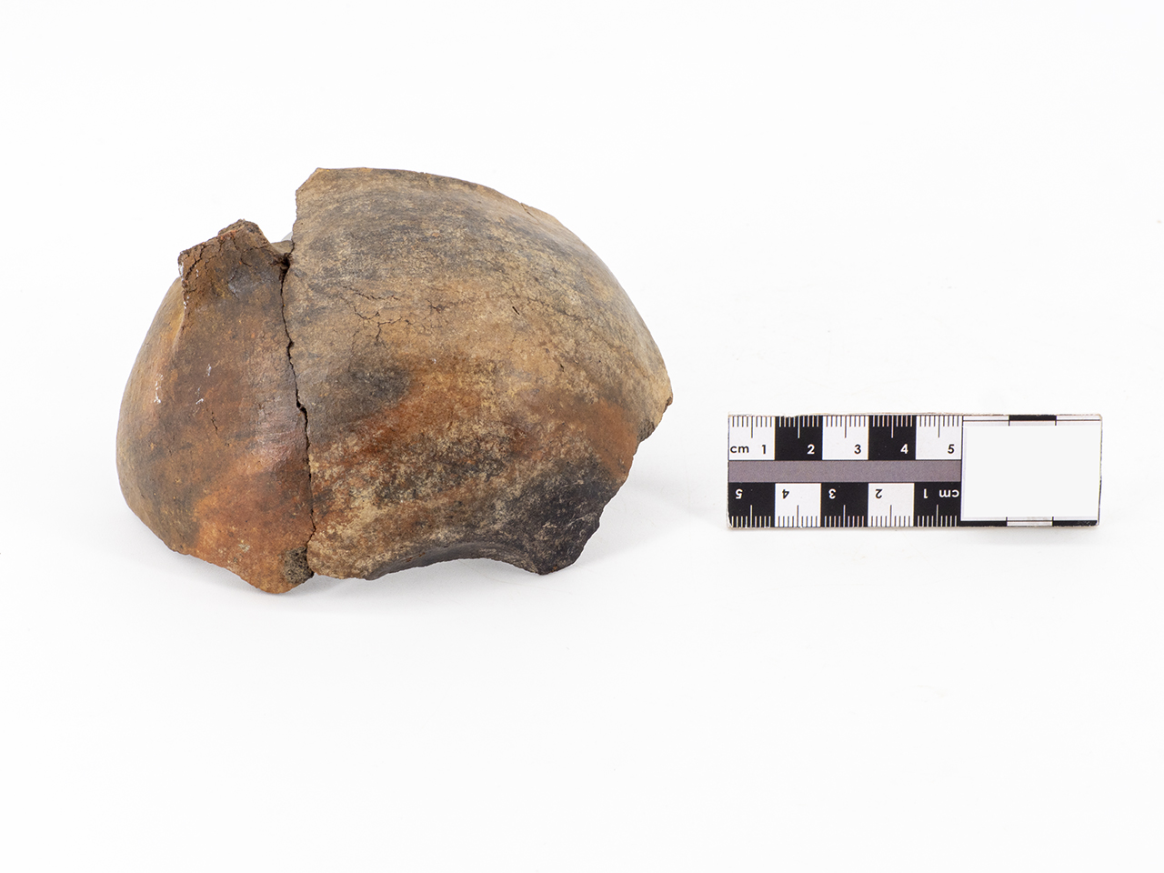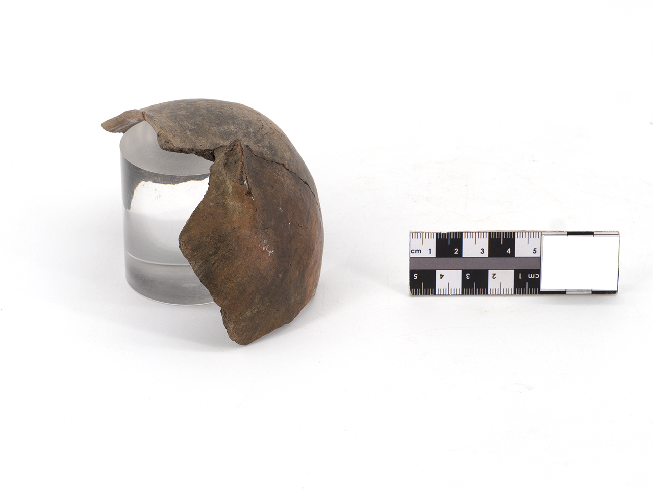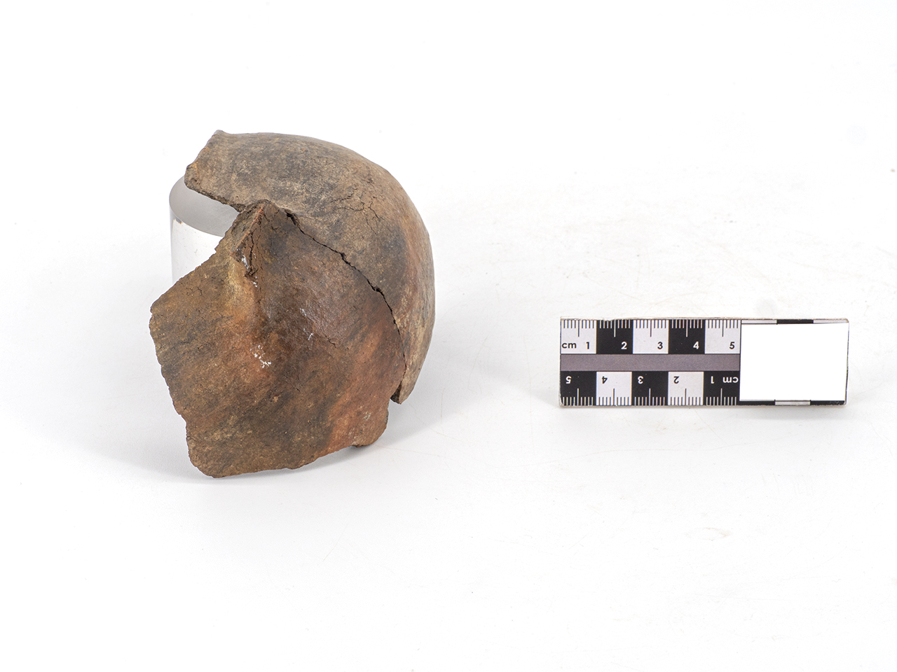 Frammento di olla in impasto bruno rossiccio; corpo globulare, orlo assottigliato, fondo ombelicato