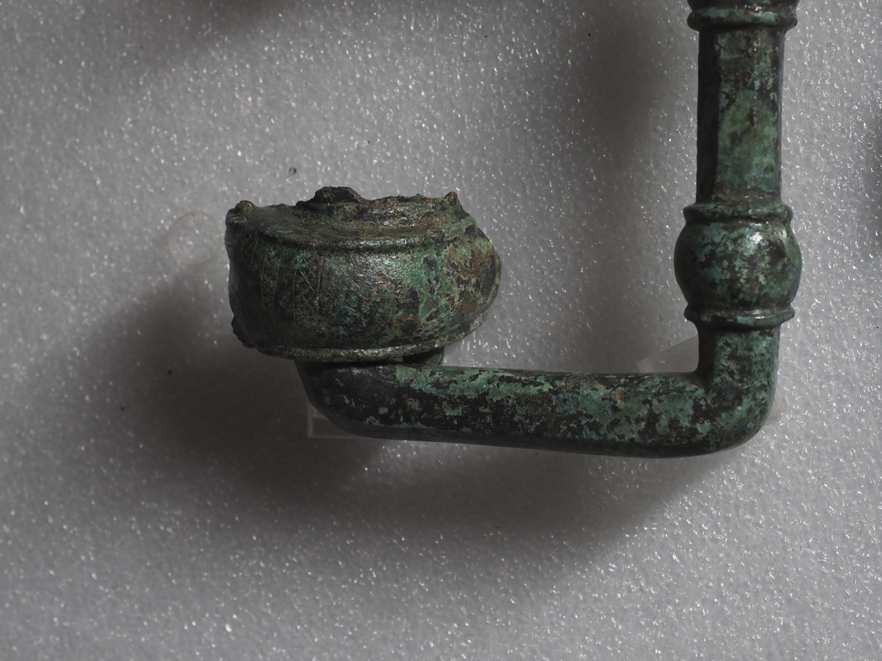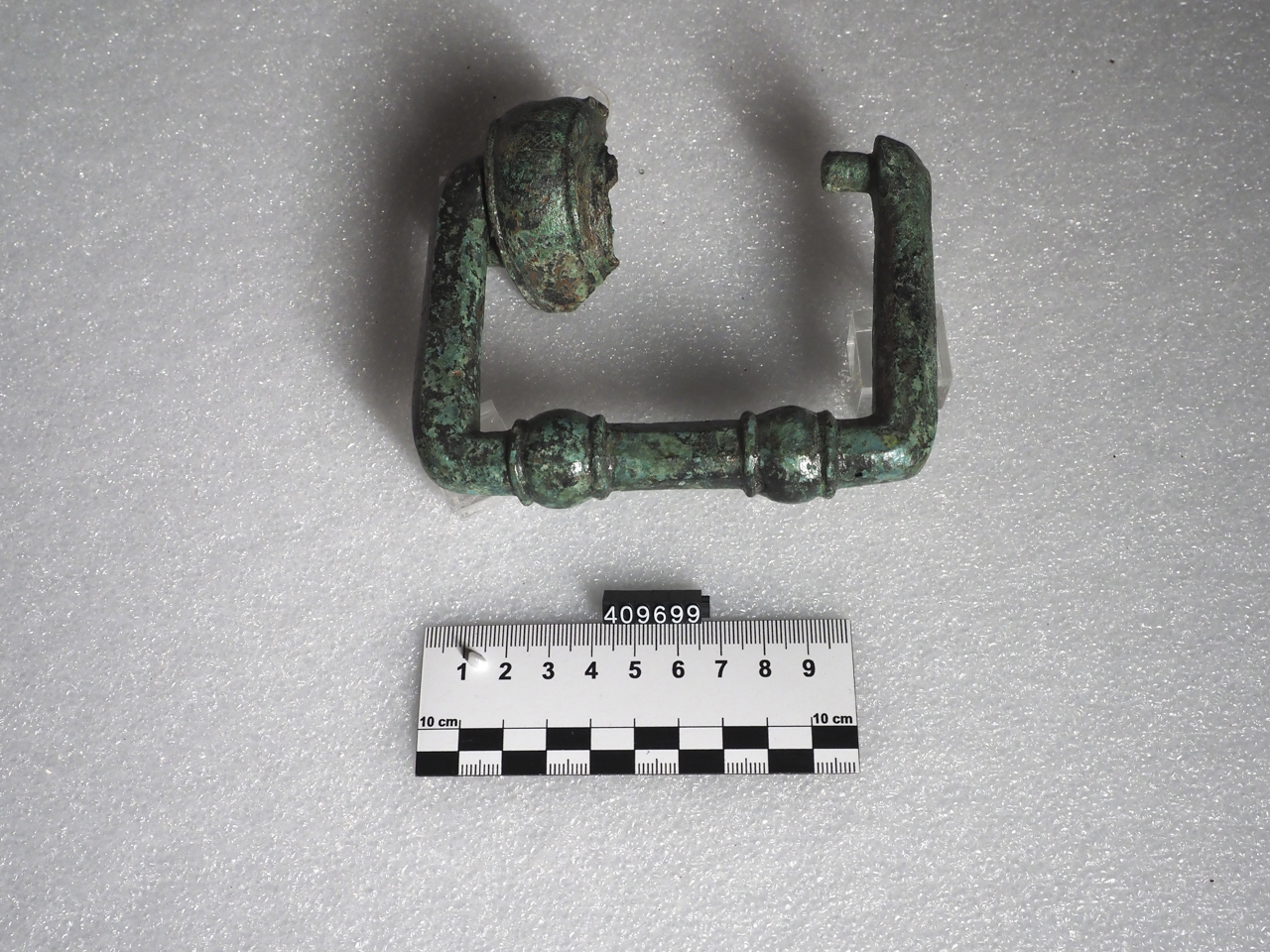 Ansa di lebete in bronzo. Ansa mobile a maniglia, con astragali sul lato inferiore, attacco a doppia protome di serpente
