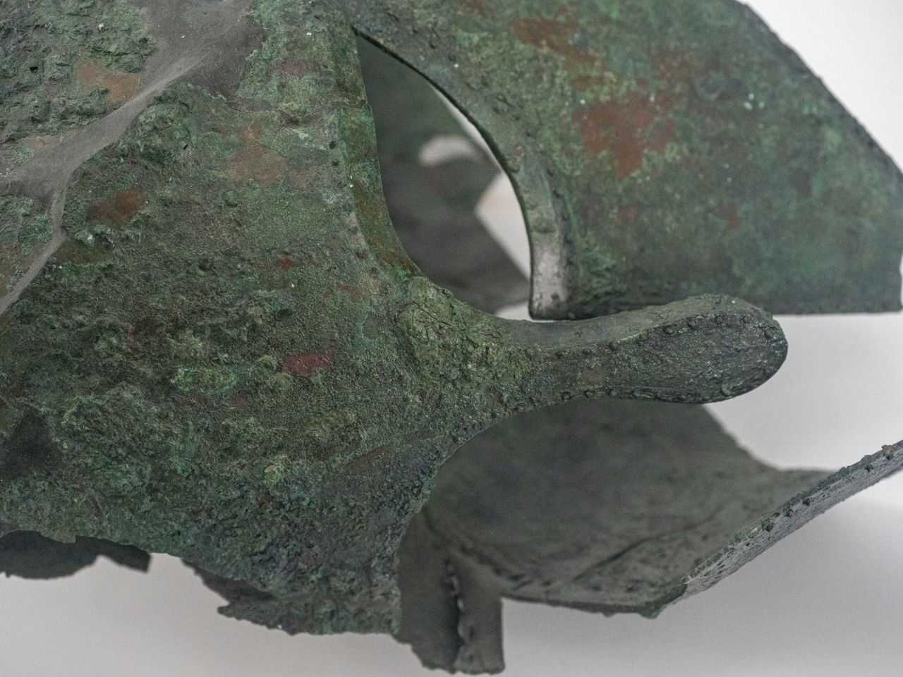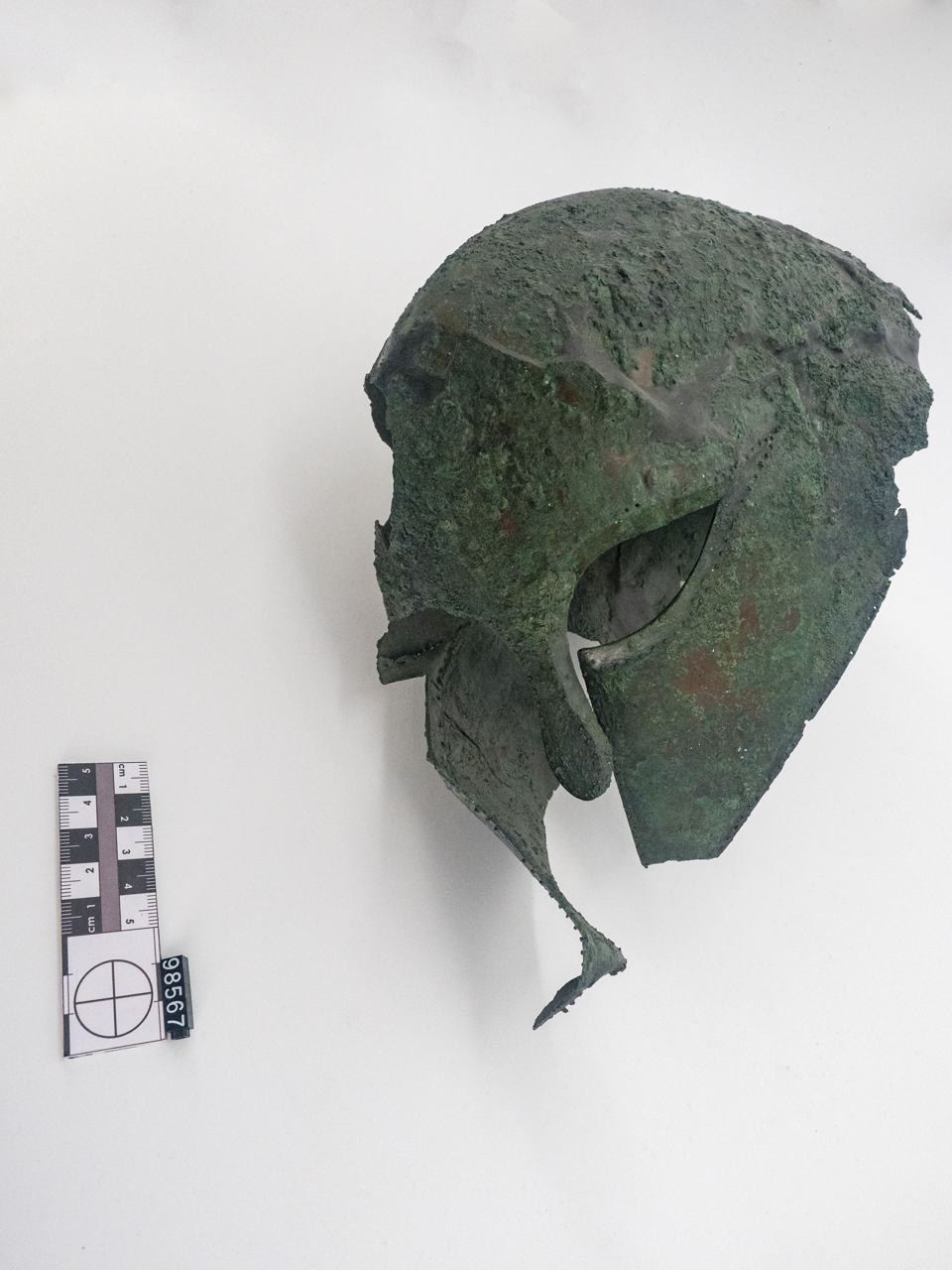 elmo di tipo corinzio con calotta allungata leggermente rientrante verso la nuca; paranuca di media larghezza con coppia di fori di sospensione; pragnatidi pronunciate con due fori nelle parti terminali; paranaso spesso