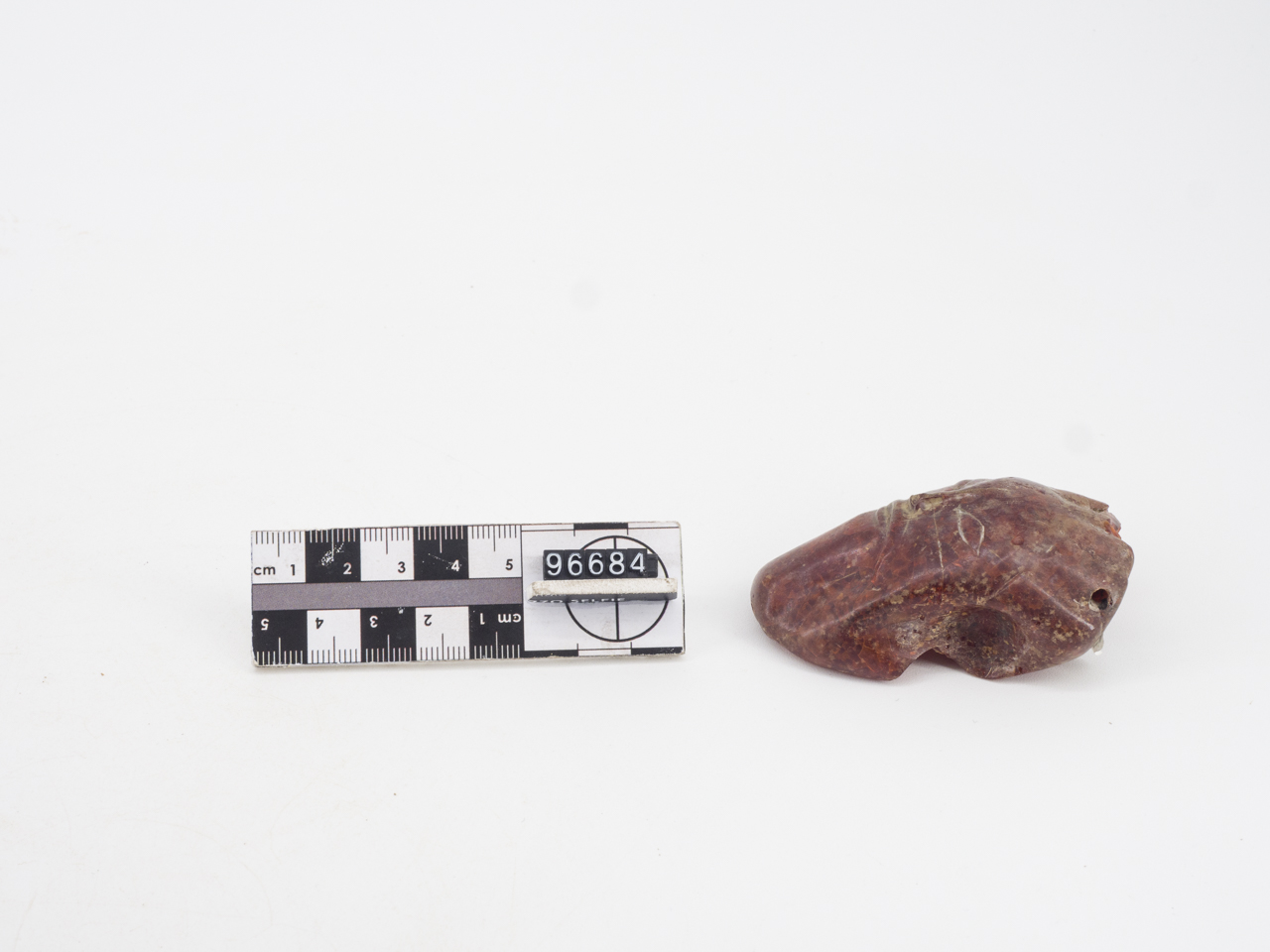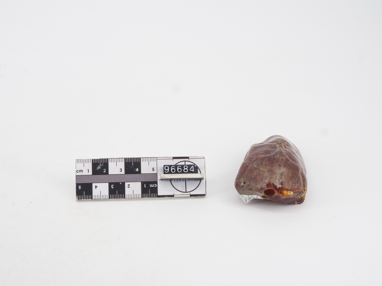 Pendente configurato a protome di Satiro. Il blocco d'ambra è stato lavorato realizzando una forma sub-rettangolare irregolare, con una sezione piano-convessa assottigliata maggiormente nella parte inferiore; la superficie esterna è liscia e ben levigata. Raffigurato il volto di un Satiro con fronte spaziosa, inquadrata da una corona di grosse ciocche rettangolari sulla fronte. Gli occhi sono a mandorla, definiti da una linea di contorno incisa, il naso è breve e sottile, le arcate sopraccigliari corte e arcuate; grossi baffi con le punte rivolte all'insù coprono completamente il labbro superiore, mentre è visibile quello inferiore, breve e carnoso. Nella parte superiore si conservano alle estremità due fori orizzontali di sospensione; un terzo longitudinale è collocato fra di loro al centro della testa, ma non percorre completamente il pendente, non fuoriuscendo dalla parte opposta. Retro non modellato