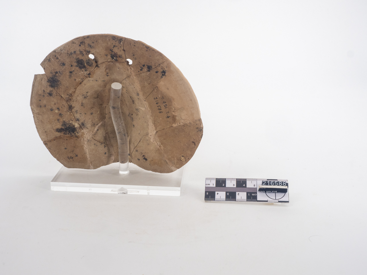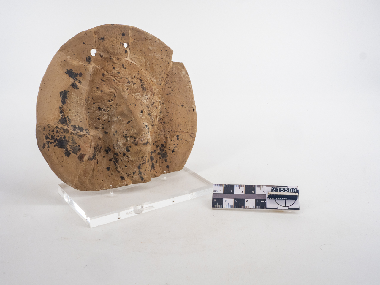disco votivo fittile a protome femminile con fori sulla parte superiore