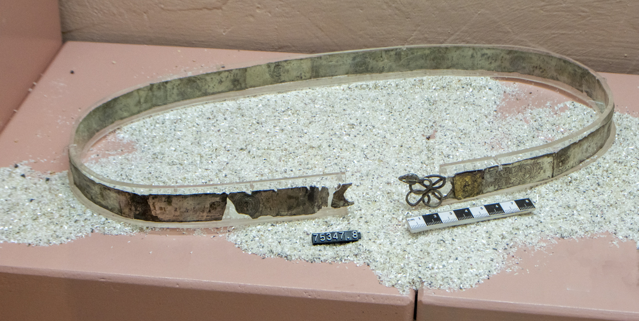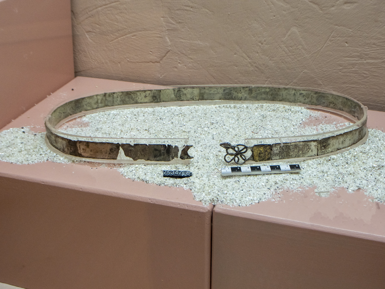 Cintura in lamina rettangolare. E' decorata a sbalzo con la protome di Helios raggiato di prospetto, ripetuta 12 volte; e con una palmetta su girali ed acanto nel settore contiguo all'estremità meglio conservata. Il fermo si prolunga dalla terminazione della lamina, che assume profilo concavo, in due corpo di serpente, a sezione circolare, che formano due spire e terminano con teste schematiche