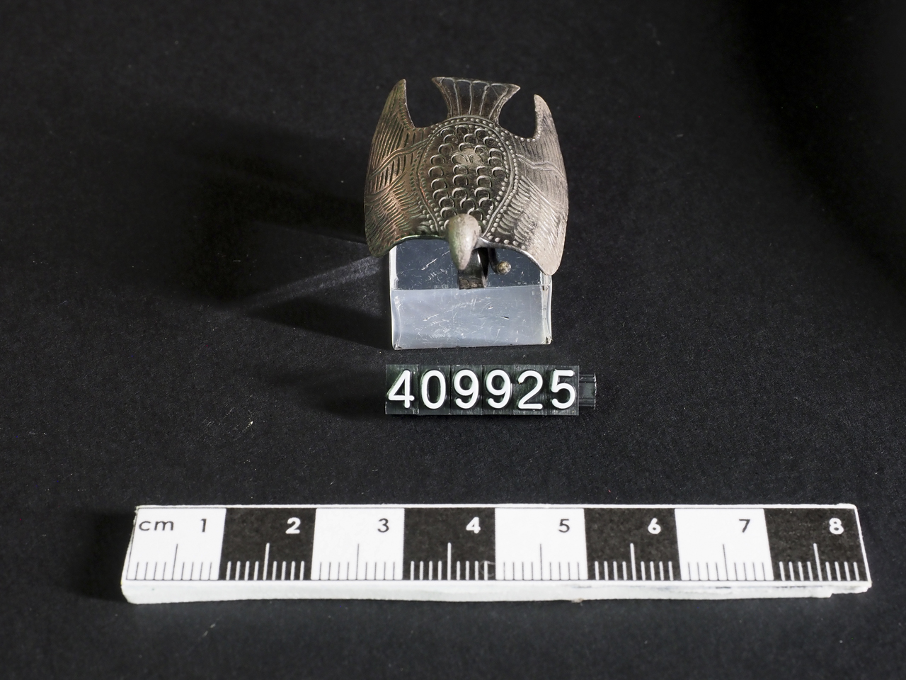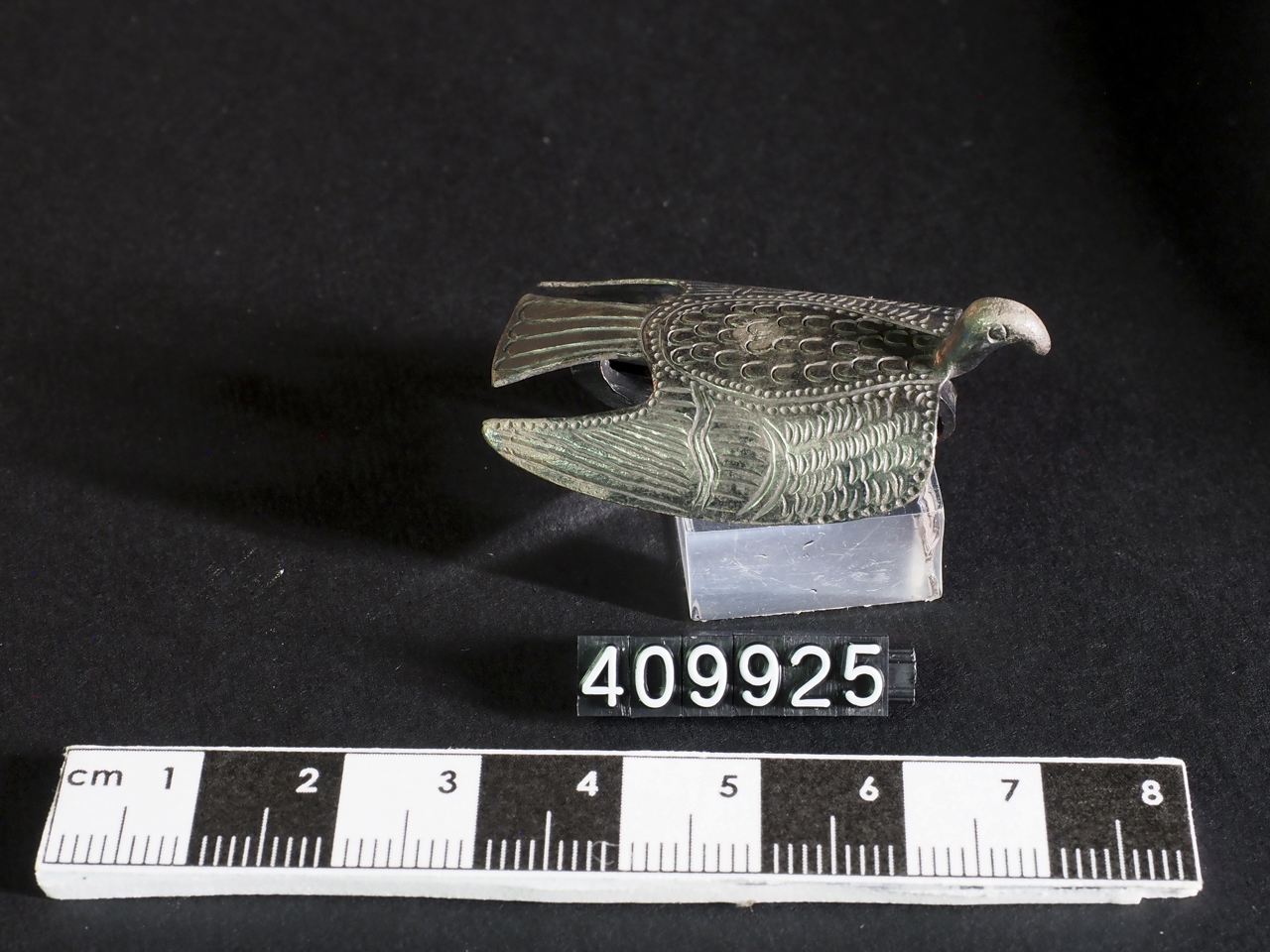 La spilla è composta da un arco a fettuccia, saldato alla faccia posteriore della lamina conformata a volatile; da una molla a due giri; dalla staffa breve, ripiegata a trattenere la punta dell'ago. L'arco è conformato a volatile con le ali distese, sulle quali e sul corpo sono accuratamente incise le piume. Le estremità delle ali, aperte in volo, sono incurvate verso il basso. Il becco è rivolto verso il basso