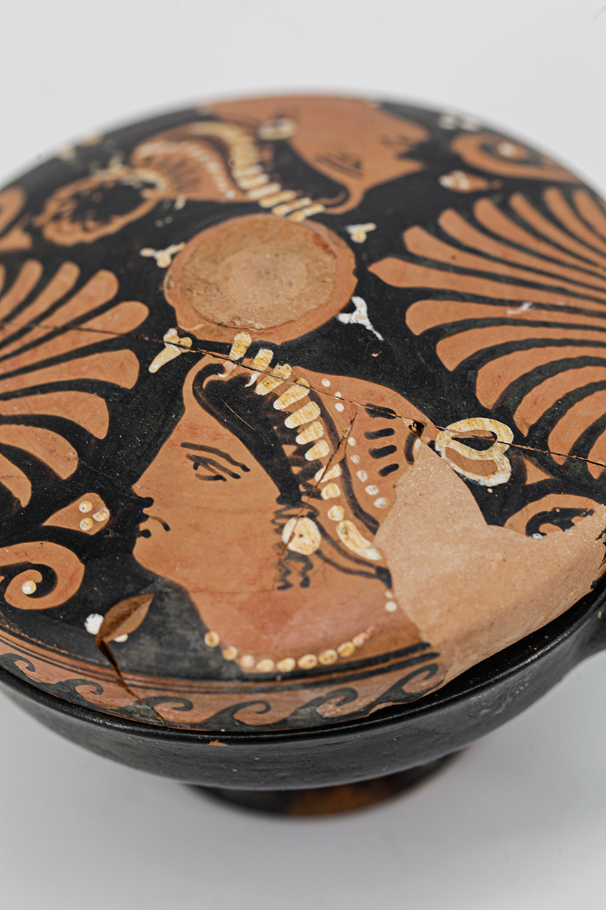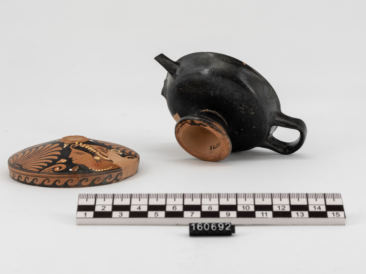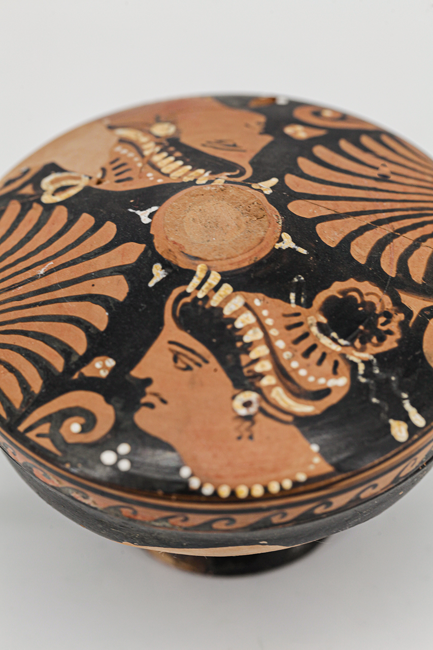 Vasca con piede ad echino, cavo; fusto tronco-conico restringentesi all'attacco della vasca carenata; orlo verticale rientrato; ansa orizzontali. Coperchio con orlo verticale; corpo a profilo troncoconico. Argilla rosata; vernice nera lucente con riflessi bluastri. Sovraddipinture in bianco e giallo. Tracce di miltos