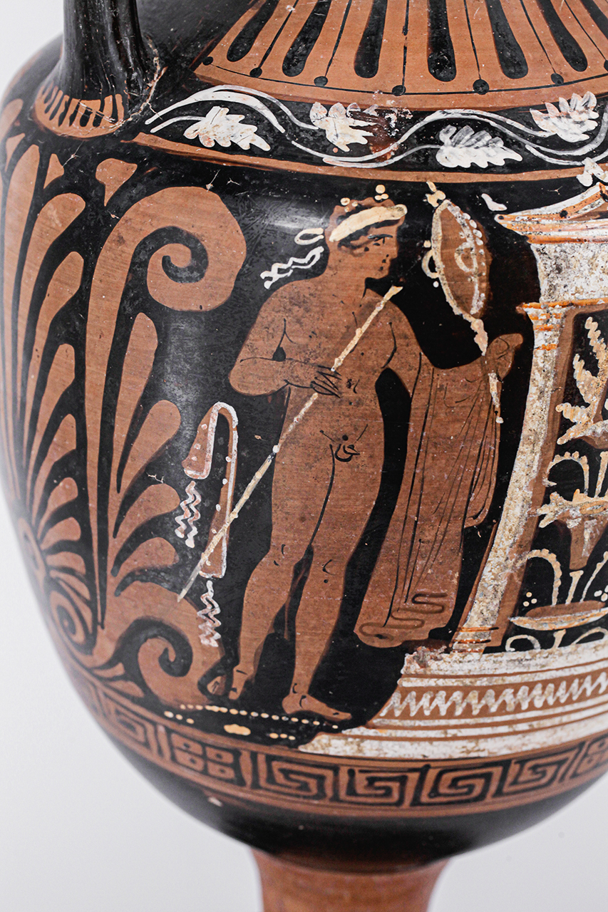 Piede ad echino, cavo, con alto fusto a profilo concavo; corpo ovoidale affusolato verso il basso; spalla rientrante a profilo concavo e continuo con il collo, interrotto da un sottile listello rilevato all'altezza dell'attacco superiore delle anse. Bocca campanulata, labbro troncococnico con orlo lievemente bombato. Anse a nastro ispessito, piatte all'interno e con il bordo arrotondato all'esterno. Argilla rosata, sovraddipintura in bianco e giallo; risparmiati una fascia alla base del piede, l'alto fusto e il taglio del labbro