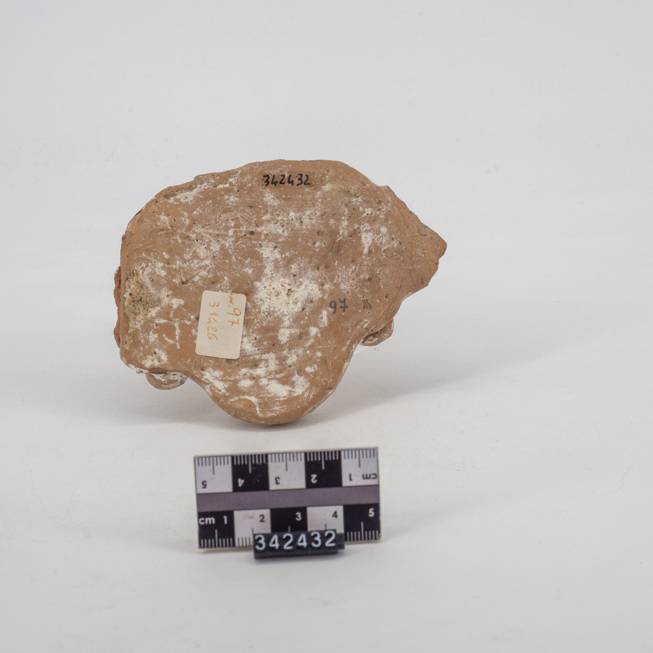 Applique con volto maschile, integra. Nella parte posteriore la superfice è stata lisciata, ma non perfettamente. Presenti incoerenze nella superficie e incrostazioni
