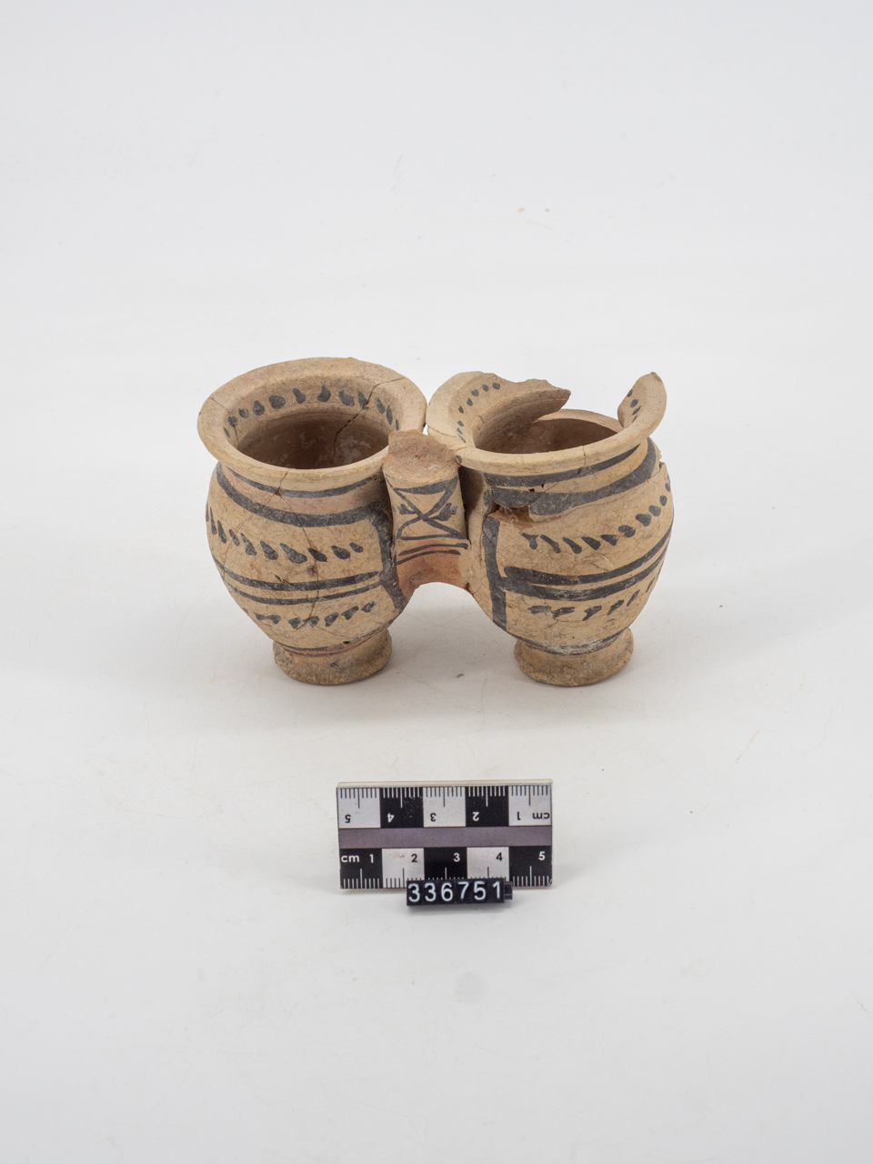Boccale gemino in ceramica sovradipinta, frammentario, ricomposto e lacunoso di parte del corpo di un contenitore e dell'ansa. Orlo superiormente appiattito e leggermente estroflesso. Corpo globulare e piede ad anello