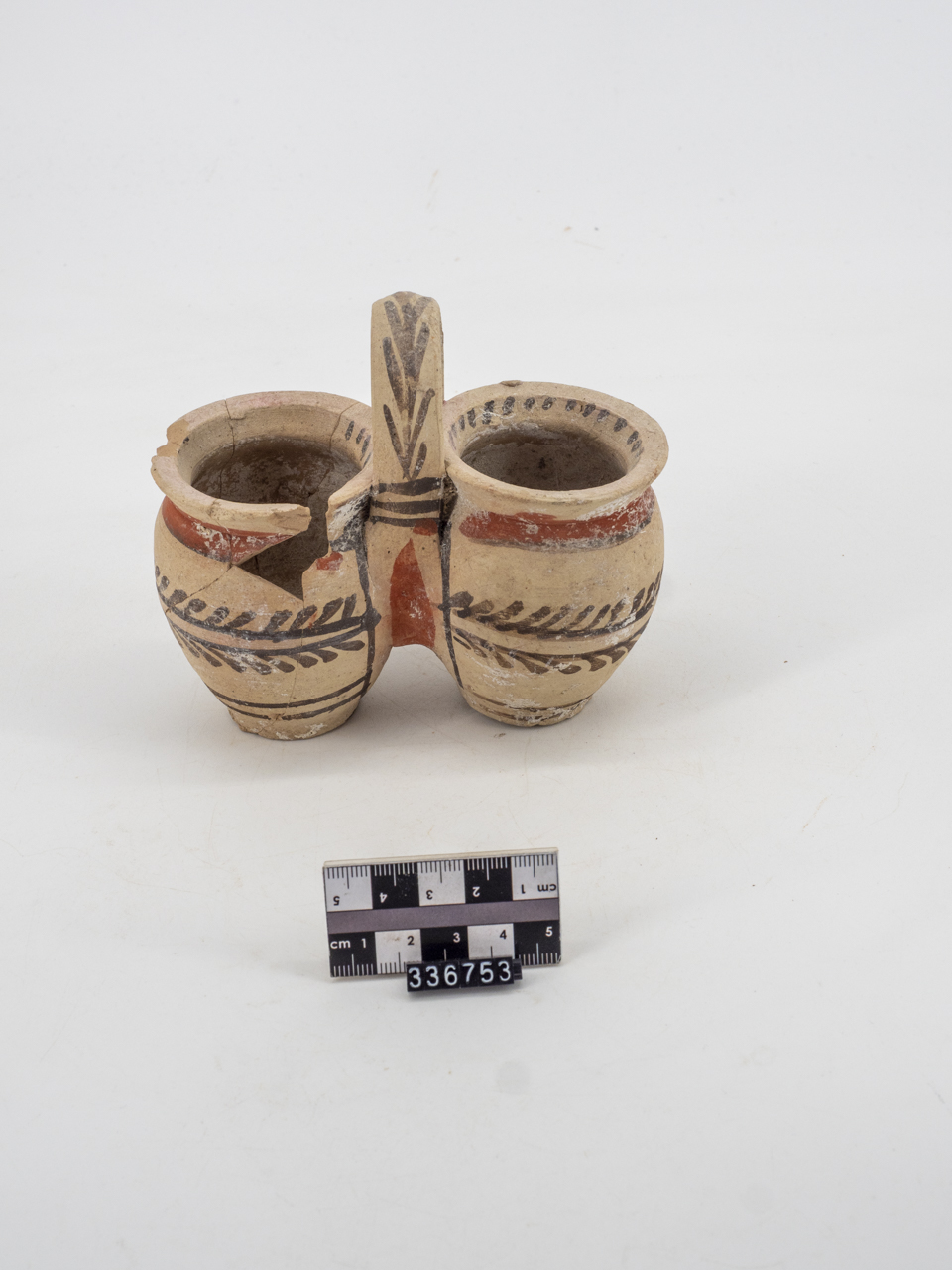 Boccale gemino in ceramica sovradipinta bicroma, frammentario, ricomposto e lacunoso in uno dei due coiontenitori. Orlo superiormente appiattito e leggermente estroflesso. Corpo globulare. Ansa a nastro, sormontante