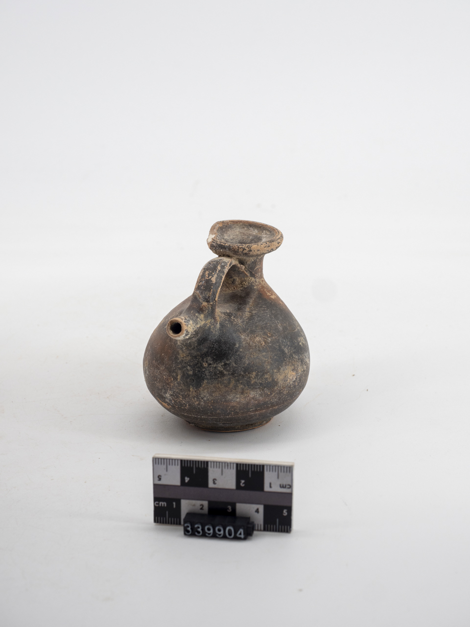 Askos completamente verniciato e mancante di una parte dell'orlo. Bocca con orlo leggermente rientrante. Ansa che si innesta sul collo e termina sul beccuccio. Breve beccuccio orizzontale. Corpo globulare e piede ad anello