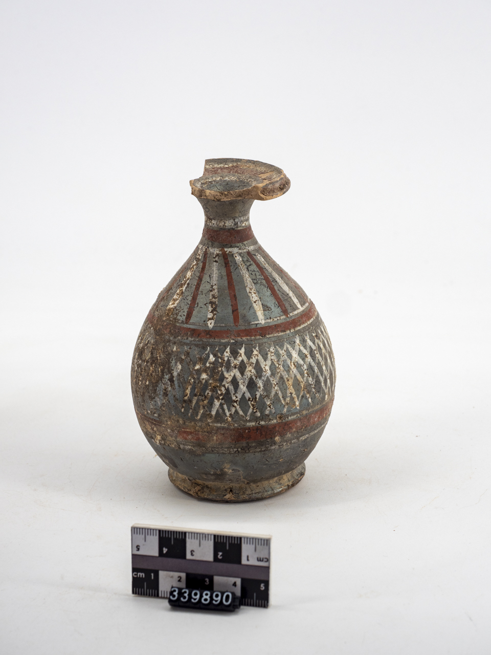 Bombylios in vernice nera sovradipinta. Orlo ad echino deformato e mancante di una parte. Stretto collo e corpo ovoidale. Piede ad anello