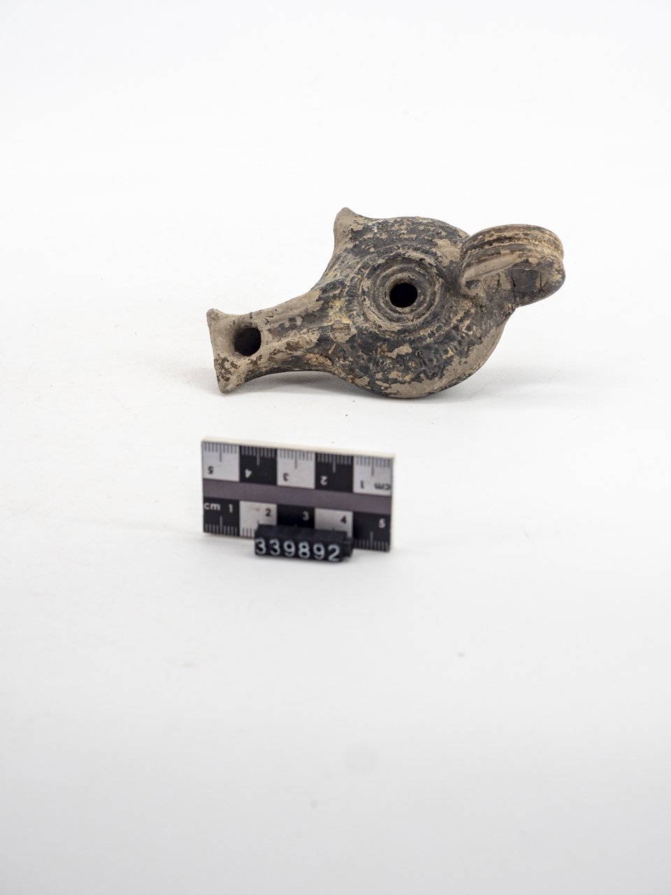 Piccola lucerna con foro centrale sul disco, sottolineato da una serie di scanalature circolari. Ansa ad anello schiacciato con scanalature. Beccuccio principale a taglio vivo. Presa laterale apicata