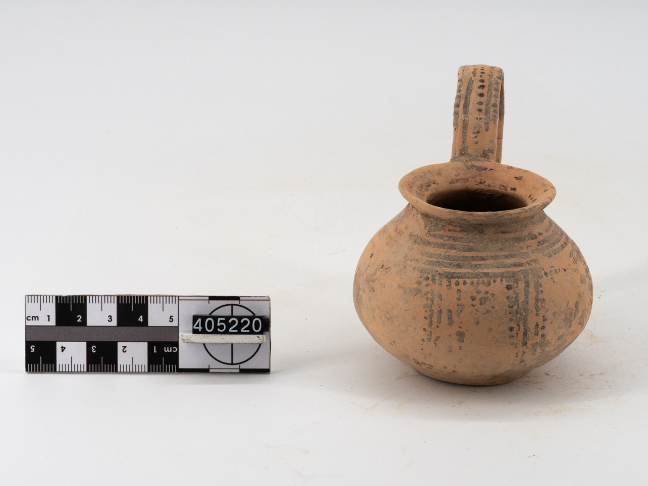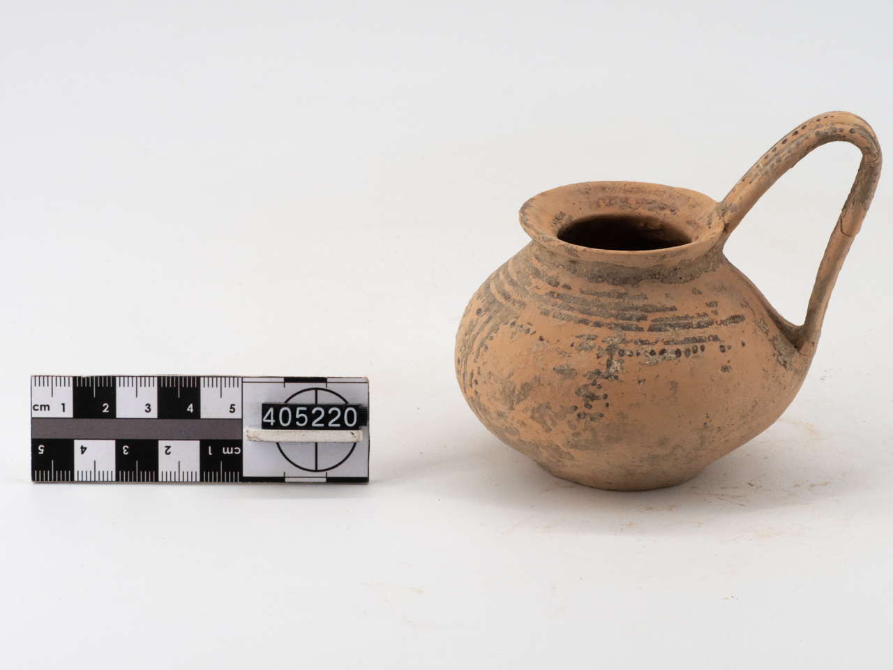 Labbro leggermente svasato, corpo globulare schiacciato, ansa a nastro verticale sormontante, fondo piano. Argilla beige-rosata, vernice rossa e bruno-rossastra