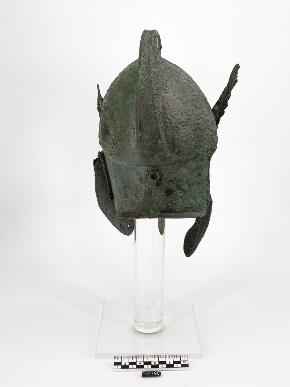 Elmo italo-calcidese in bronzo. La calotta presenta sulla sommità una crista. Una carena orizzontale corre sulla superfice sottostante. Le paragnatidi mobili, con doppia lobatura mediana, sono fissate mediante cerniere fermate con perni di ferro.Due ali sono fissate sulla calotta appena sopra le paragnatidi. Due ganci sono posti al centro della calotta e all'altezza del paranuca