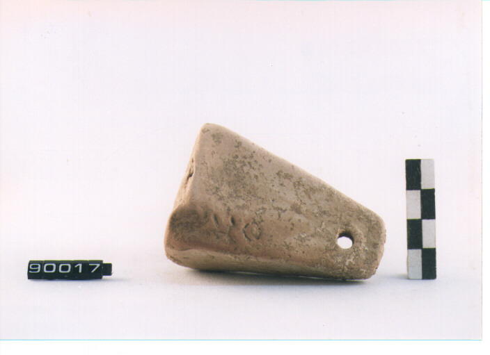 PIRAMIDETTA FITTILE A BASE QUADRANGOLARE PIANA CON FORO PASSANTE FRONTALEPOSTO SOTTO L'APICE, SUPERFICIE LISCIA INCROSTATA CON TRACCE DI ISCRIZIONE GRAFFITA