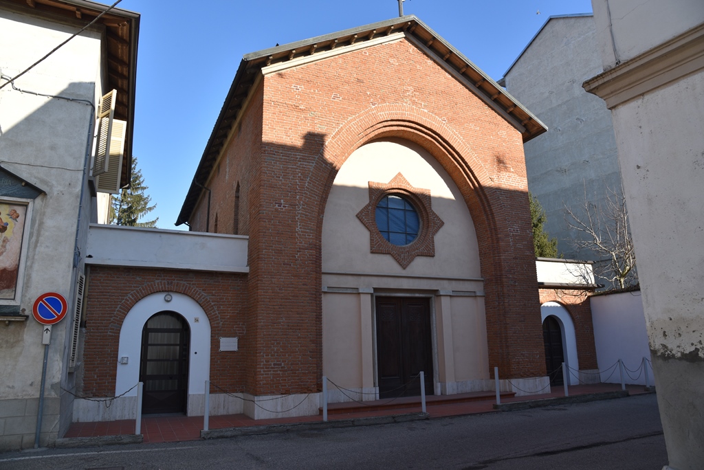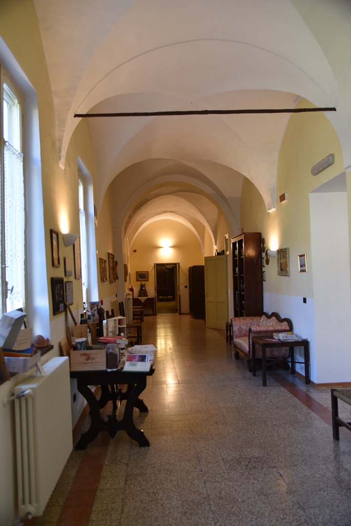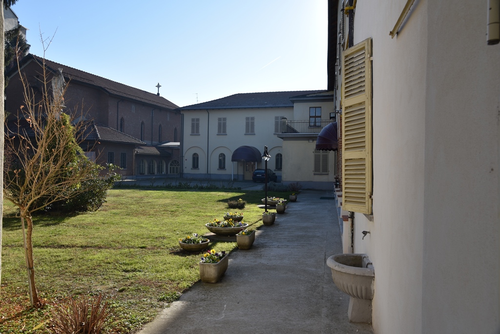 La sede dell'Istituto della Sacra Famiglia delle figlie di Maria Ausiliatrice sorge su quello che era, fino al 1802, il convento dei Padri Carmelitani a cui era annessa la chiesa di Santa Maria delle Grazie. Nel fabbricato perpendicolare all'asse stradale, sono ancora ben visibili nella muratura esterna verso il cortile, sette colonne con capitello cubico, tipologicamente assimilabili a quelle del portico di San Pietro, sempre a Trino, ancora coperte di intonaco. L'interno del piano terra, seppur rimaneggiato, presenta nella sala del refettorio, una bellissima volta a costoloni incrociati secondo gli assi e non secondo le diagonali del vano, e altre sale con volta a vela romboidale. Il piano superiore che attualmente ospita il dormitorio delle religiose, è attraversato da un corridoio centrale e con volte a botte su cui affacciano le celle, con uguale copertura. La descrizione prosegue nel campo OSS – Osservazione alla fine della scheda