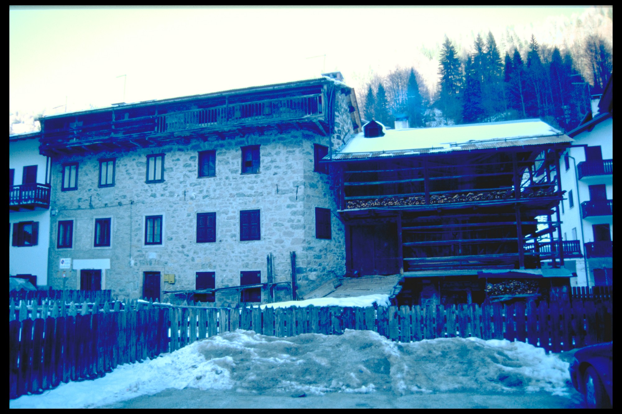 Struttura orizzontale in pietra e legno, struttura verticale in pietra e legno, tetto in legno a falde con copertura in lamiera