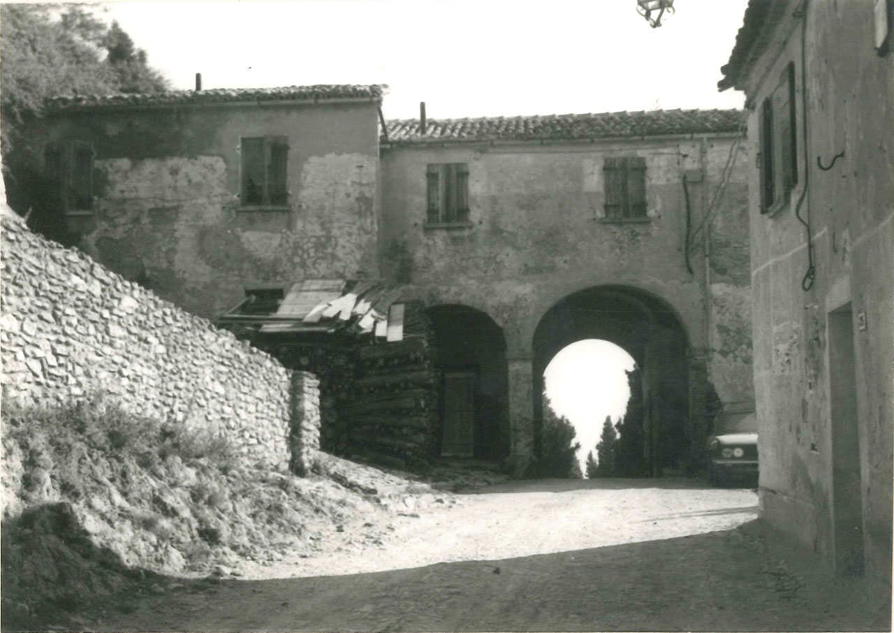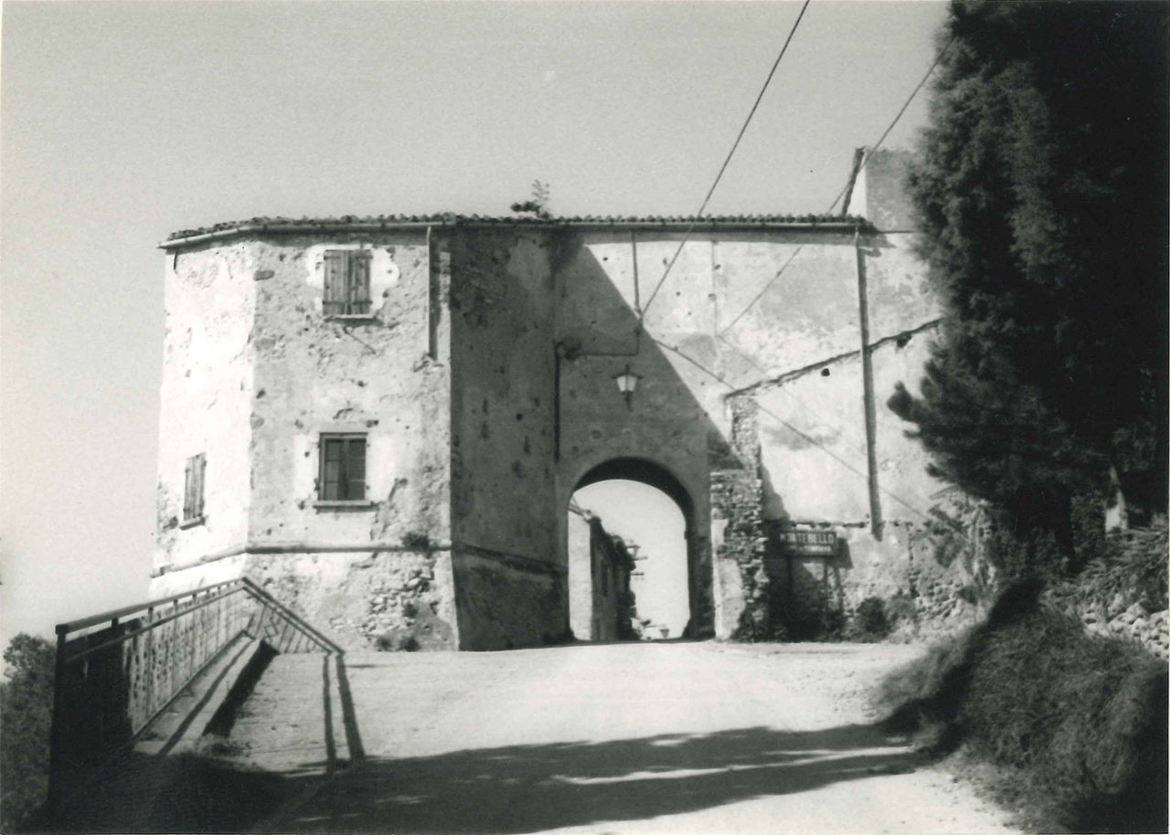 Il complesso TORRE-PORTA-POSTO DI GUARDIA era parte integrante delle antiche mura che cingevano interamente la Città e che si raccordavano, nella parte sopradescritta, alla rocca. All’interno della torre poligonale, dopo aver salito la piccola scala d’accesso, iniziava un passaggio (segreto?) che portava, attraverso rampe inclinate e di scale, direttamente alla rocca soprastante. La porta d’accesso alla città, contenuta nel complesso, è in pietra locale frammista a mattoni; le superfici sono intonacate. La torre, nella parte inferiore, ha i muri a sghembo, delimitati, nella parte superiore, da una doppia fila di mattoni sporgenti. Gli interni sono molto mal conservati, con vistosi rifacimenti dei solai e delle pareti. Sul lato che guarda verso la cinta interna sono posti 2 archi sostenuti da colonne quadrate in mattoni