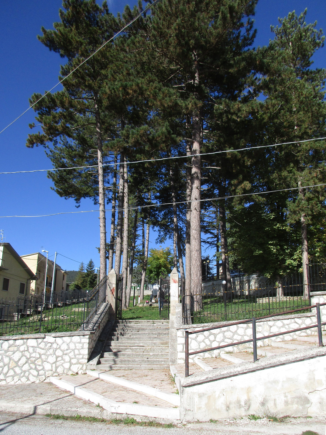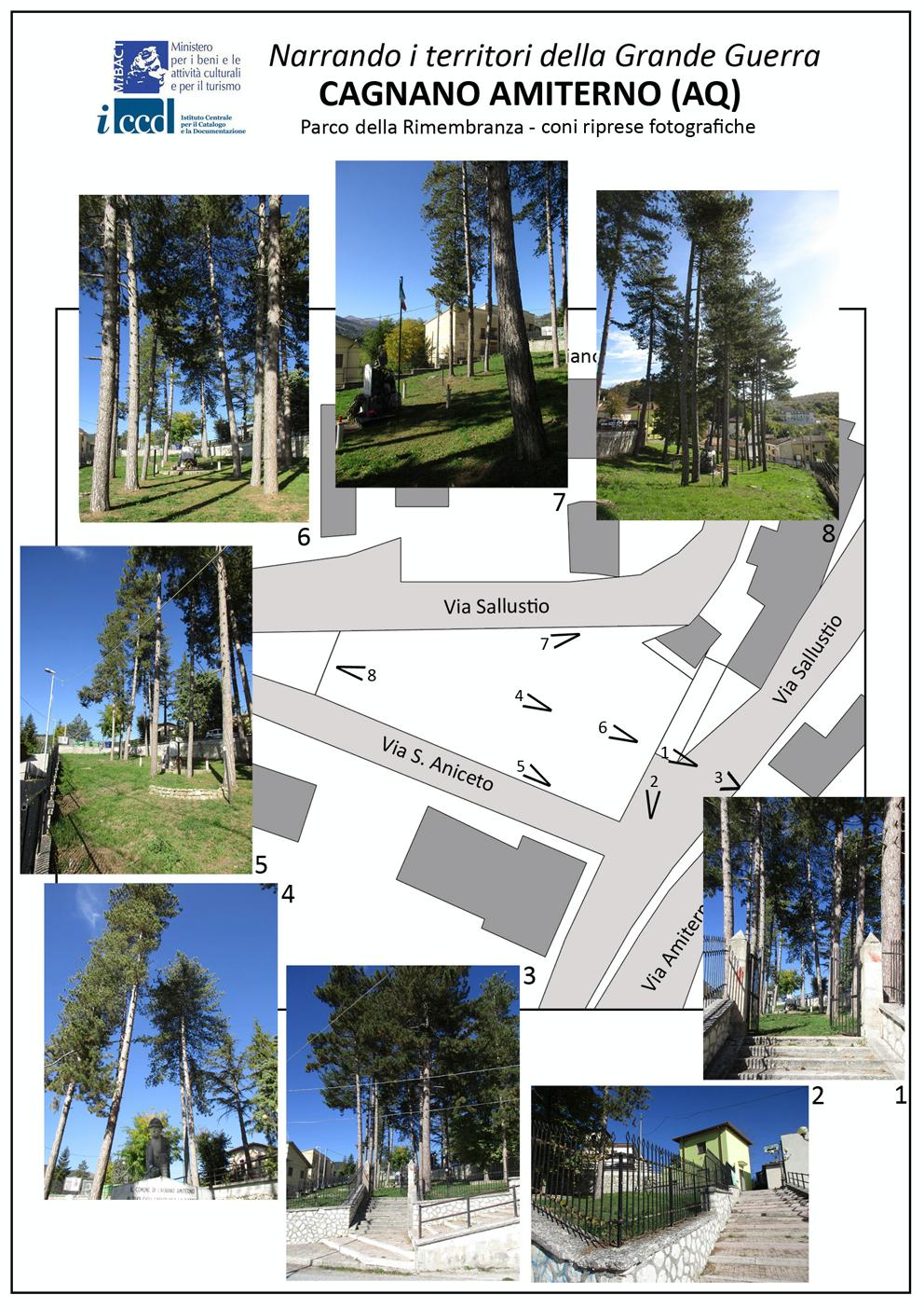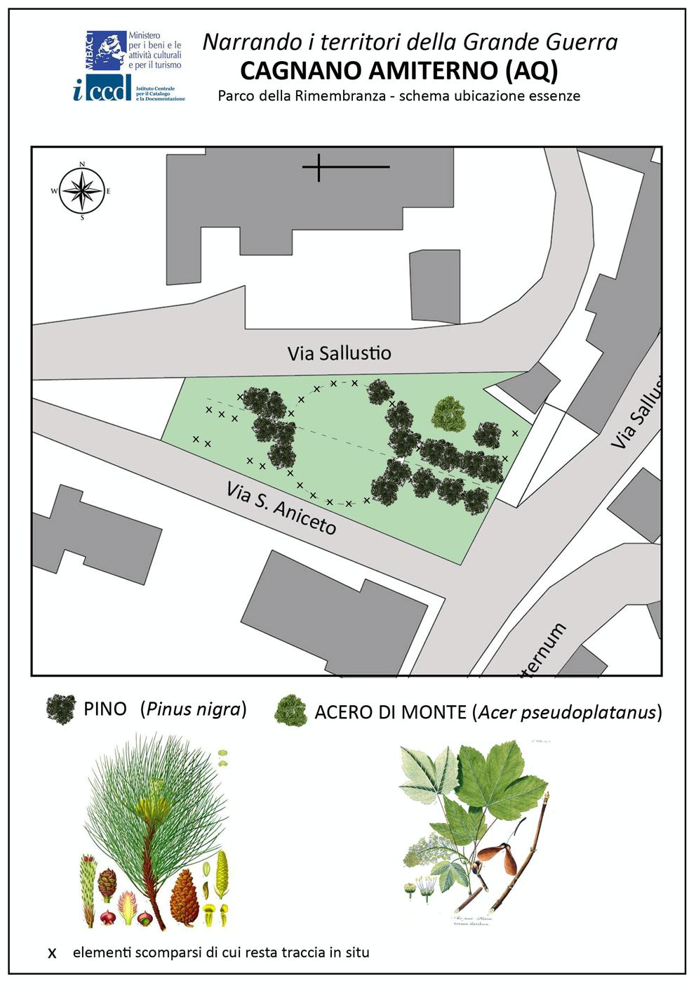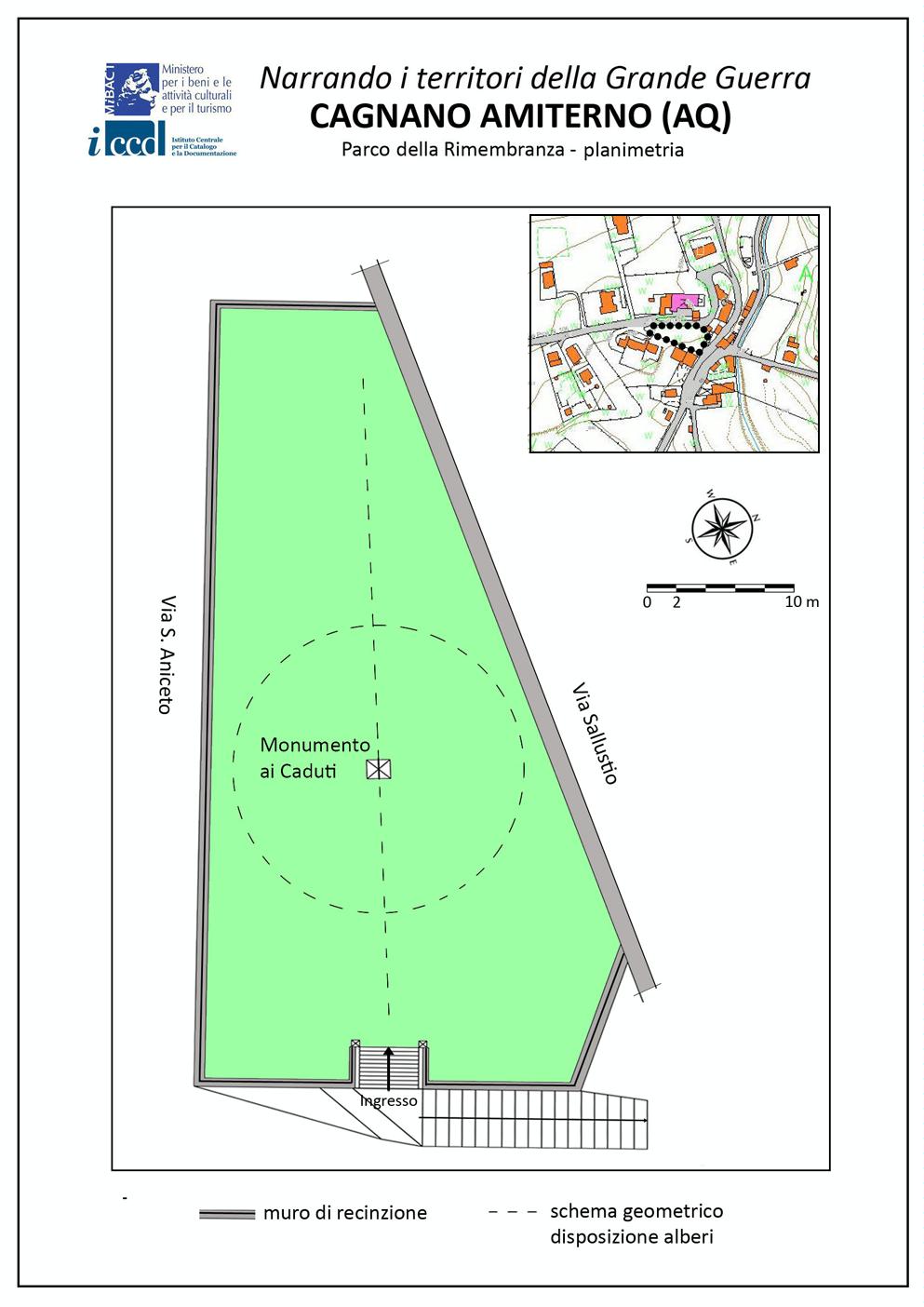 Il Parco della Rimembranza di Cagnano fu realizzato su progetto di Domenico Di Massimo nel 1923 e prevedeva in origine la messa a dimora di alberi di platano acquistati dalla Ditta Fratelli Ingengoli di Milano. Esso si colloca in un terreno di forma quasi triangolare sito in pendio, nella località S. Cosimo di Cagnano, a breve distanza dalla chiesa dei SS. Cosma e Damiano. Esso è delimitato sul lato Nord e su quello Sud-Est da Via Sallustio e sul lato Sud-Ovest da Via S. Aniceto. Un muretto con inferriata in ferro ne perimetra l'area e si presenta privo di pavimentazione. L'unico accesso è costituito dal cancello posto sul lato SE lungo via Sallustio dotato di una piccola scalinata (Foto 1-3). Nel centro del Parco è collocato il Monumento ai Caduti (v. scheda OA 1300282940) (Foto 7). Sono al momento esistenti n. 18 alberi di pino ed un solo albero di acero, la cui piantumazione è da considerarsi successiva ai platani di progetto, ma comunque riferibile alla prima fase d'impianto del Parco (anni '20) (Foto 4-8). Sono inoltre visibili i resti di numerosi altri alberi che un tempo dovevano essere in situ (è stato possibile contarne almeno 25). Il numero complessivo dovrebbe quindi corrispondere al numero dei caduti della Grande Guerra che si desume dalla relativa lapide. Da tali evidenze si deduce come la disposizione dei pini avvenisse lungo due filari con orientamento S.E.-N.O. intersecanti un circolo disposto attorno al Monumento (v. pianta ubicazione essenze)