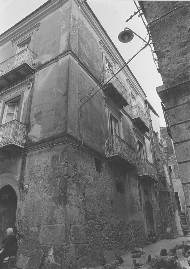 L'edificio si sviluppa su tre piani compreso il piano terra. La pianta ha impianto regolare ed è di forma trapezia. La muratura, intonacata, è in pietrame, di varia pezzatura, montato a filari con impiego di elementi in pietra squadrata di reimpiego. La copertura è a tetto con due spioventi con raccordo angolare, con orditura lignea e manto superiore in coppi. All'interno otto unità abitative e un negozio