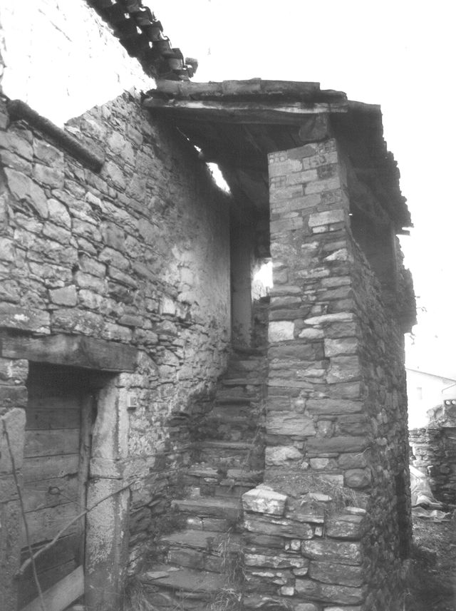 Edificio con pianta ad L a tre piani, in muratura di pietra listata; scala esterna di accesso con copertura in coppi; orizzontamenti in legno; copertura a due falde con manto in coppi. Unità collabente