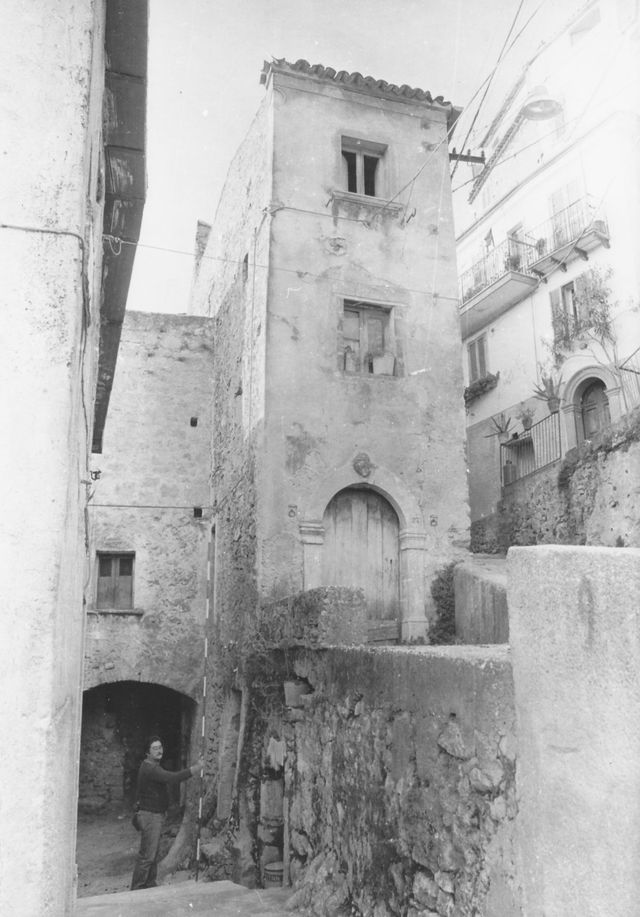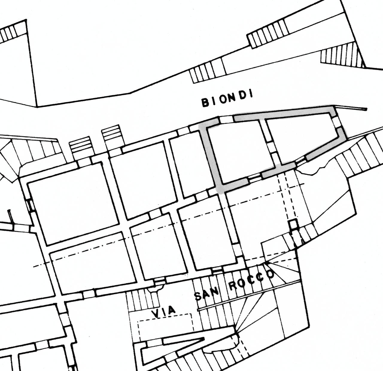L’edificio è in pianta di forma irregolare e si sviluppa su quattro livelli di piano di cui uno seminterrato al quale si accede dal Vico San Rocco. I primi due piani sono situati a livelli diversi e hanno ingressi autonomi, quello superiore si accede da una botola con una scala in legno. La facciata Est rivela un chiaro carattere ottocentesco, il portale in pietra con arco a tutto sesto presenta sul concio di chiave uno stemma, le finestre ai piani superiori hanno cornici modanate. La facciata a Nord presenta aperture irregolari. La muratura portante è in pietrame del tipo a sacco e la copertura è del tipo a falde con cornicione modanato