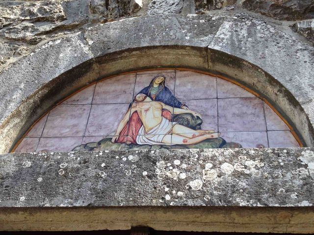 La chiesa ad aula è in pianta di forma rettangolare, le murature perimetrali sono in pietra locale sbozzata; la facciata principale è a capanna, al centro in asse il portale, una lunetta semicircolare con al centro in ceramiche dipinte l’immagine del Cristo morto e della Madonna, una finestra rettangolare ed all’incrocio delle falde un il campanile a vela