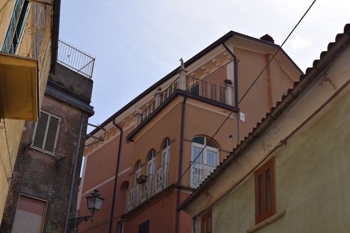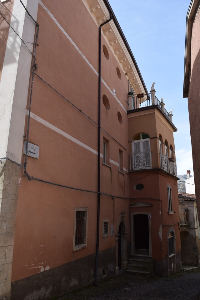 Edificio d’angolo a pianta poligonale a quattro livelli fuori terra ed un seminterrato. La muratura è in pietra intonacata ed il tetto è in parte a falde con manto in coppi e in parte terrazzato. Il cornicione è modanato e retto da mensole come i balconi. L’ingresso principale è posto su Via Orta Piana ed è realizzato ad arco a tutto sesto con concio in chiave scolpito. Sullo stesso prospetto vi è un loggiato con archi a tutto sesto e piccoli oculi ovali. Il prospetto su Corso Vittorio presenta al piano terra due portali ad arco ribassato in pietra ed in asse, ai piani superiori, due finestre e due balconi. L’edificio è abitato ed in discreto stato di conservazione. Sono presenti quattro unità abitative, quattro locali deposito ed una rimessa