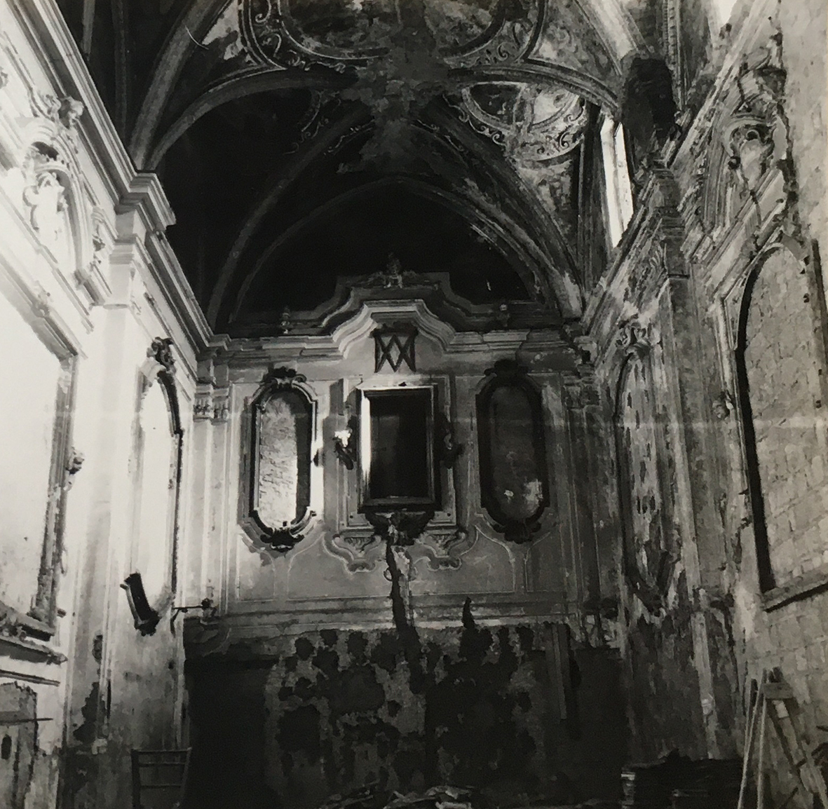 Le due facciate esterne, s'inseriscono senza soluzione di continuità nelle quinte dei palazzi adiacenti, tanto che quella rivolta verso sud, con le finestre della chiesa ed i balconi degli ambienti sovrastanti, non si differenzia dalla facciata di un palazzo d'abitazione; la quinta verso ovest presenta l'entrata alla chiesa ed i resti di riquadrature e decorazioni. L'interno della chiesa è un ambiente unico coperto da volte a crociera rettangolari archiacute con tre finestre nel lato dx