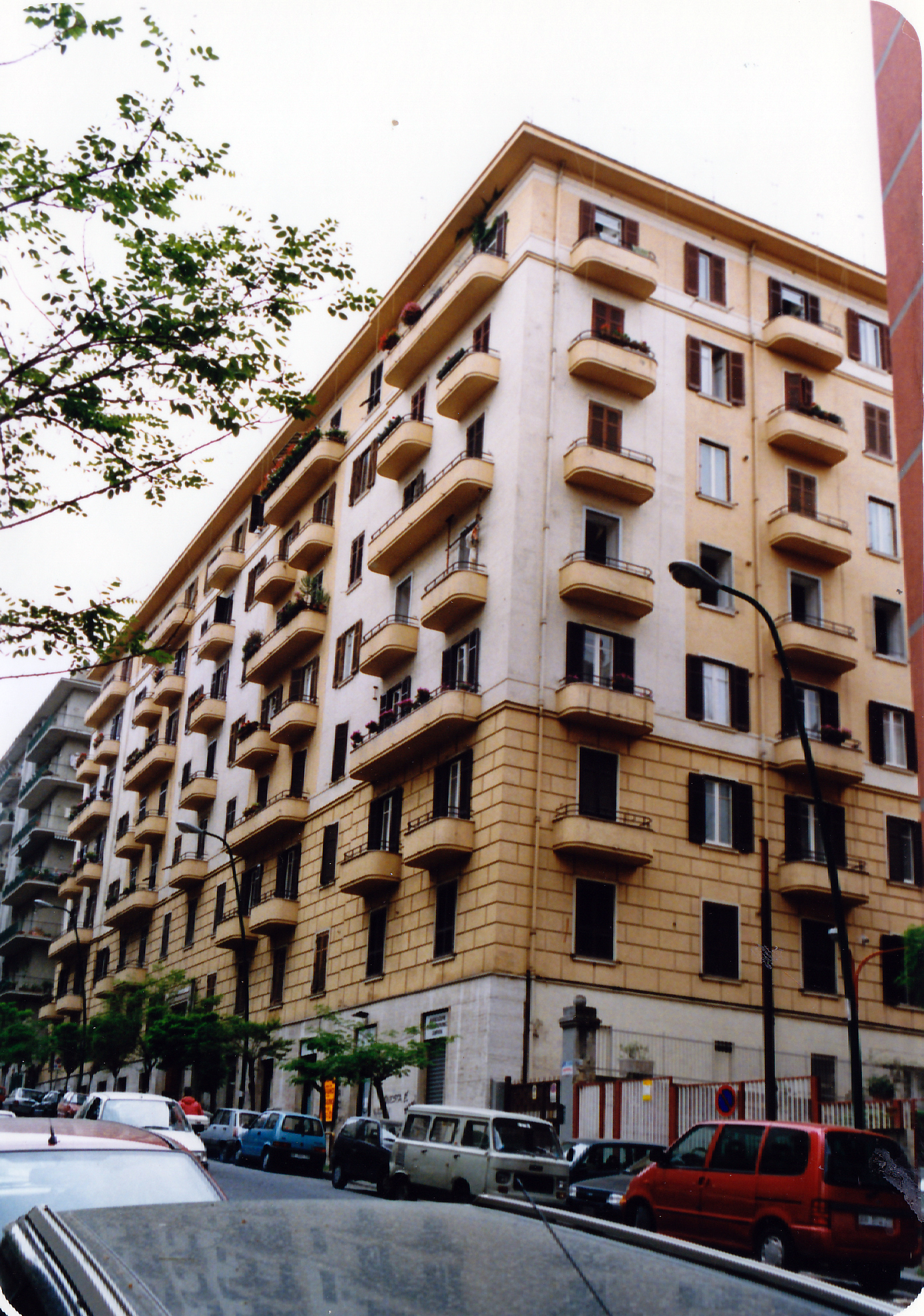 Il grande complesso abitativo si sviluppa con un volume compatto su una piianta ad L che racchiude, sul lato posteriore, un'ampia corte-giardino. L'edificio si sviluppa su sotto livelli serviti da due corpi scala situati agli angoli; la struttura portante è stata realizzata con telai di cemento armato, le tompagnature con spessi muri di tufo, i solai sono piani in cemento armato e laterizi, la copertura è piana, a terrazzo