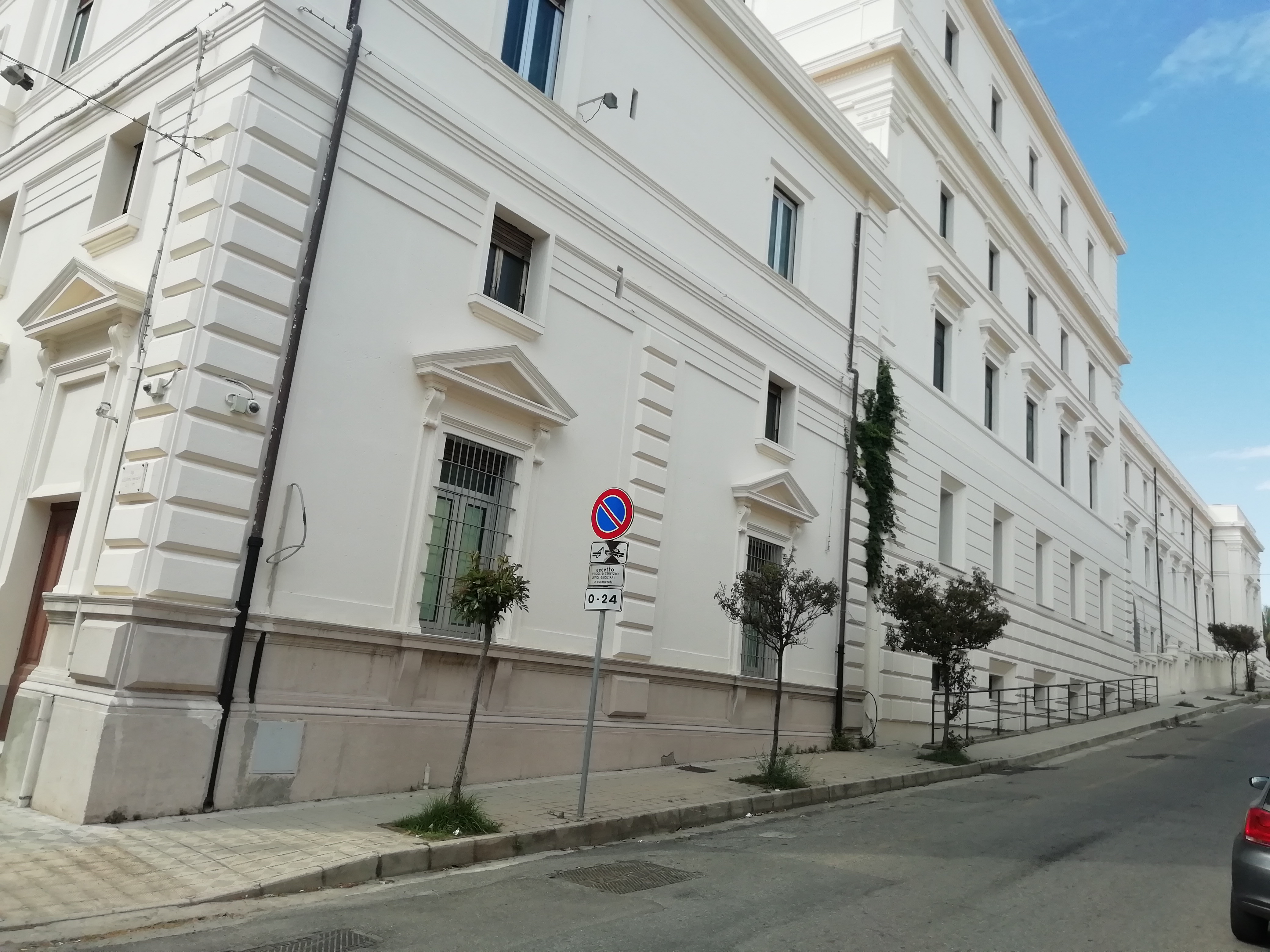 Il palazzo, si inquadra all'interno di un progetto di riqualificazione edilizia avviata a partire dall'approvazione del piano de Nava ed occupa una della quinte di piazza Castello. Lo stile architettonico compositivo, permeato nell'impronta neoclassica si segnala per la sua imponenza; il gioco di rientranze e sporgenze della facciata principale mettono in evidenza il corpo di fabbrica centrale caratterizzato da alcune linee monumentali. La forte pendenza del terreno comporta dei dislivelli nell'articolazione complessiva della struttura. Il corpo principale collegato con le altre parti da ampi corridoi e la grandiosa architettura degli esterni che contribuisce a dare un aspetto unitario e monumentale ad una struttura pensata con finalità di razionale distribuzione degli uffici. Il manufatto presenta una configurazione tipologica a doppia corte, chiusa con copertura a terrazza e due piani fuori terra. Il fronte principale, di forma rettangolare e delimitato verticalmente da lesene piatte di ordine ionico poste agli spigoli, si eleva su un'ampia scalinata ad ordine unico, con un gigantesco colonnato ionico che scandisce le aperture. Il portale è costituito da tre grandi aperture architravate sovrastate da tre grandi finestroni rettangolari tripartiti e chiusi da inferriate artisticamente lavorate che ripetono le stesse linee decorative dei cancelli degli ingressi. Ai suoi lati si susseguono due serie di finestre incorniciate e sormontate da un decorato cornicione lineare in aggetto al di sopra del quale si trovano decorazioni circolari incave. Il basamento in bugnato liscio contiene le aperture del seminterrato. La parte sommitale del manufatto inizia con una grandiosa trabeazione, poco sviluppata nel rilievo ma molto alta, sopra la quale poggia la ricca cornice di gronda e si conclude con un parapetto in muratura che si innalza in corrispondenza dell'ingresso principale. Gli altri prospetti, di altezza maggiore per il dislivello dell'isolato, ripetono le stesse linee architettoniche del prospetto principale e risultano divisi orizzontalmente da ricche cornici marcapiano