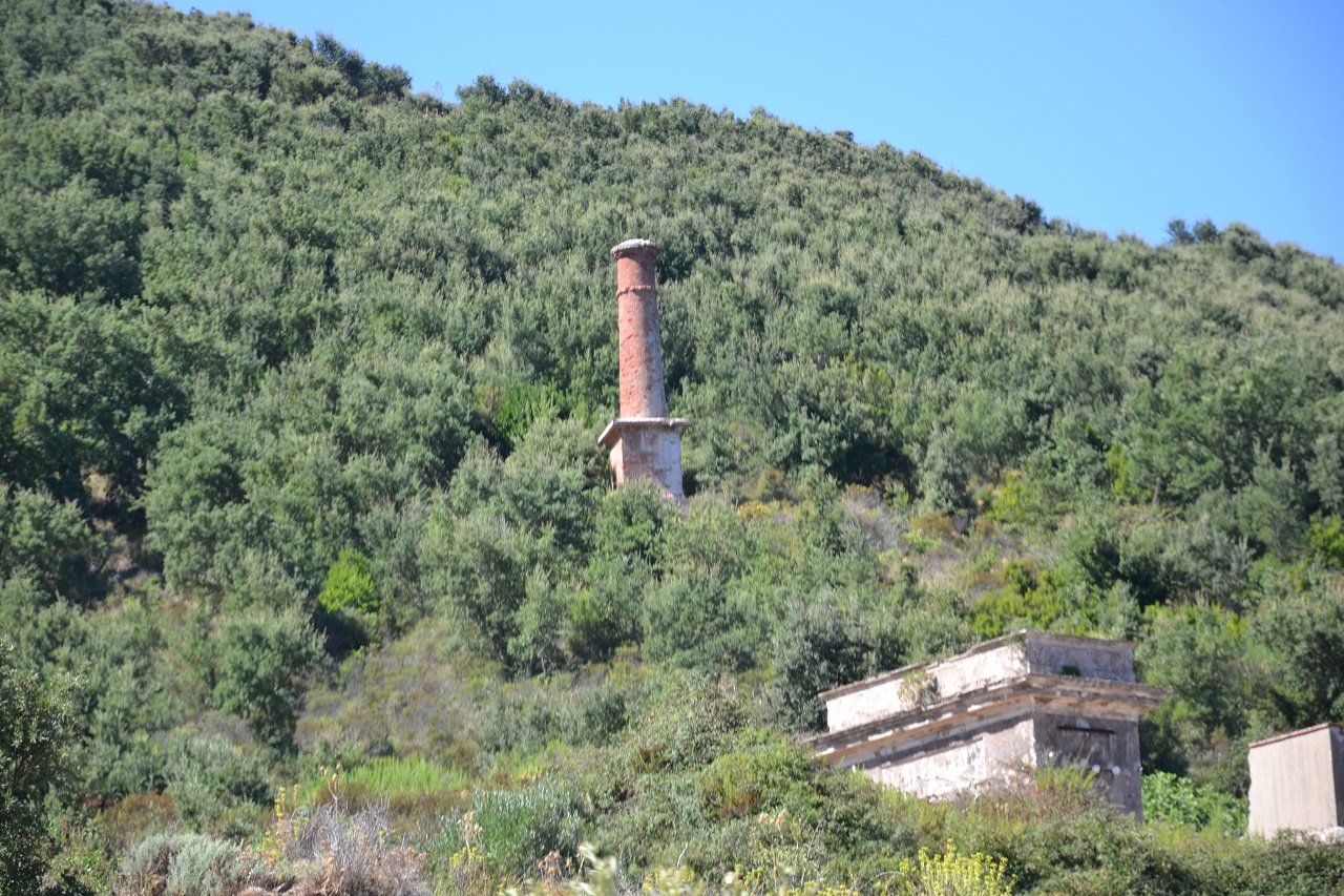 La scheda ha per oggetto il sistema destinato allo smaltimento dei fumi prodotti dalle macchine di estrazione del Pozzo di Baueddu. Tale sistema si compone di una condotta di allontanamento che parte dal luogo di produzione e, appoggiata a terra, segue le pendici della scarpata vicina risalendola sino ad una certa quota d' imposta del camino. La condotta è attualmente occultata dalla vegetazione, mentre ancora integro risulta il camino che, sviluppandosi per una altezza limitata, realizza il necessario salto di quota per favorire l’uscita dei fumi per depressione. Tale sistema, diffuso in tutti i cantieri minerari Sardi, permetteva di evitare le complessità legate alla costruzione di un camino eccessivamente alto (n.d a.). L'elemento verticale, cioè il camino vero e proprio, rappresenta l'elemento più significativo del sistema e costituisce un elemento caratterizzante del paesaggio. Completamente realizzato in mattoni pieni a vista l'opera realizza il tema della colonna su di un’alta base. La base quadrata e rastremata leggermente verso l’alto è scandita in un attacco alla fondazione dove il raccordo con la parte piena della muratura avviene con mattoni posti di coltello e sagomati a guscio, in un episodio centrale, ed infine in una cornice modanata sempre di mattoni a vista. Su tale base poggia il camino dalla sezione tronco-conica che termina con una sorte di cornice-capitello anticipata da un leggero collarino sempre realizzati con mattoni messi di testa nelle diverse giaciture