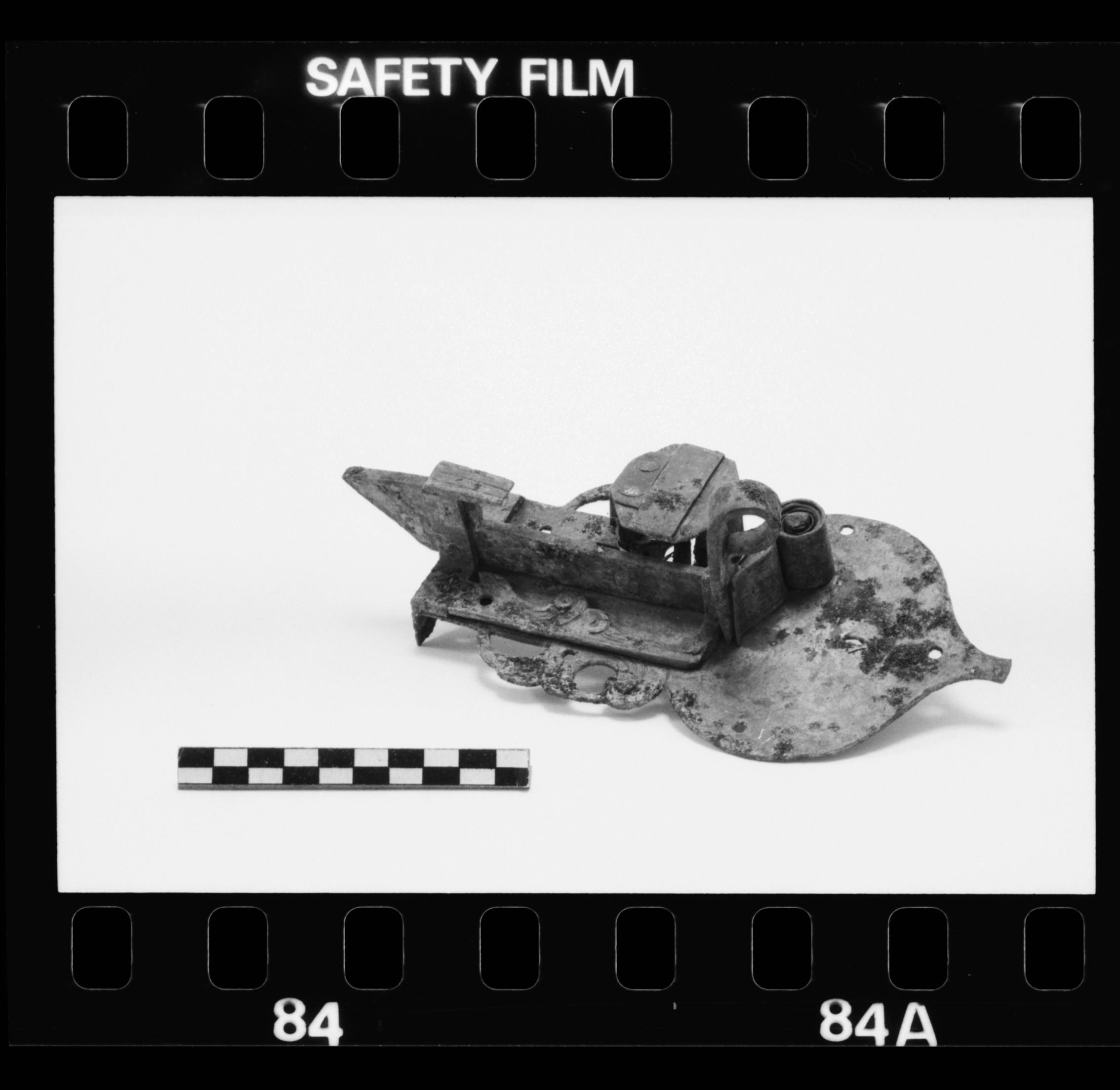 Serratura con piastra a toppa. Congegno integro con castelletto piatto. Decorazione fitomorfa stilizzata