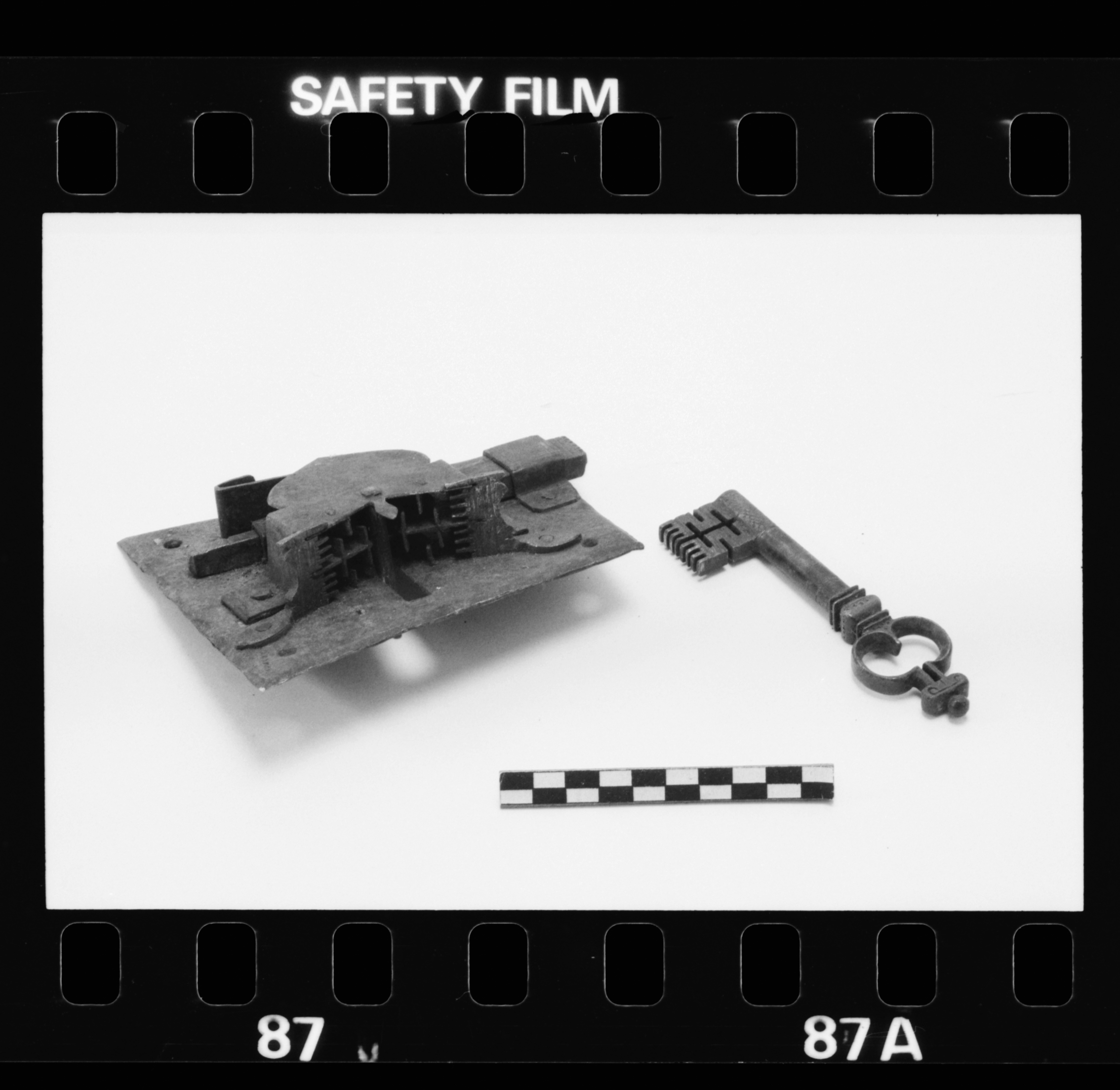 Serratura trapezoidale con congegno integro. Chiave con impugnatura a "fagiolo" sormontata da pomolo trilobato. Ingegno a doppia croce con otto dentini