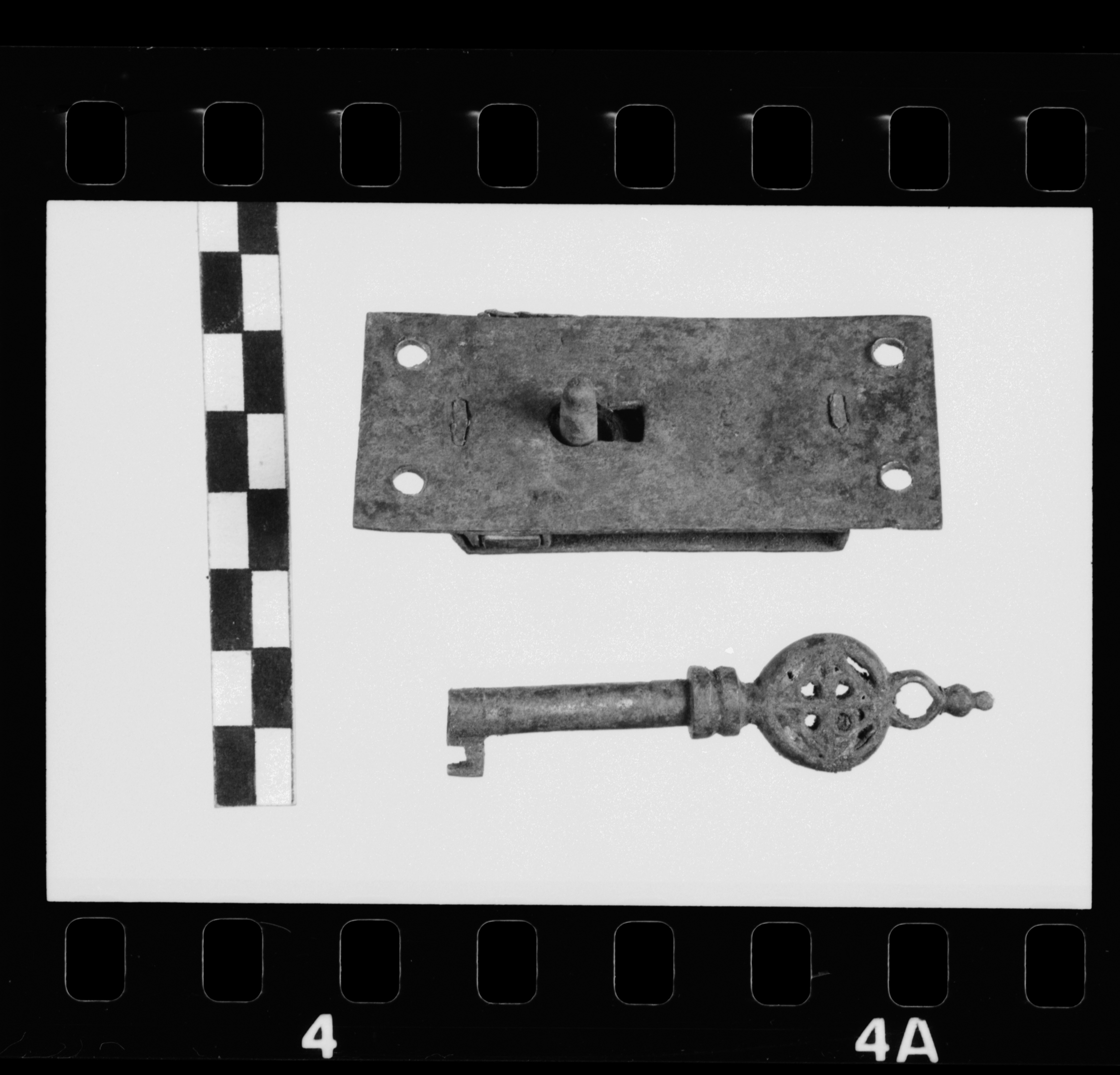 Serratura rettangolare con anima del cannello della chiave sporgente. Congegno integro. Chiave con impugnatura lavorata a traforo e anella superiore da un doppio pomolo. Vera a doppio dado e cannello femmina. Ingegno a ingranaggio semplice