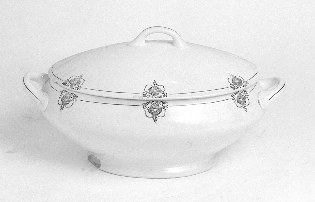 Zuppiera con motivi floreali verdi su sfondo bianco avorio