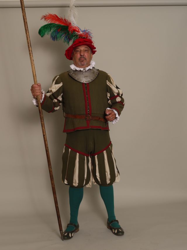 Il costume rappresenta il Fante delle Corporazioni appartenente al gruppo dei Fanti delle Corporazioni del Corteo Storico Fiorentino. E' composto da un giubbone e brache sbuffanti con tiracchie di panno verde oliva soppannato in stamina bianca con bordature rosse, calze verdi e scarpe a zampa d'orso. La berretta in panno rosso è decorata da piume colorate. Il collo è cinto dalla gorgiera mentre la vita lo è da cintura di cuoio con guaina per custodire il pugnale sul fianco sinistro. Nella mano destra stringe una picca