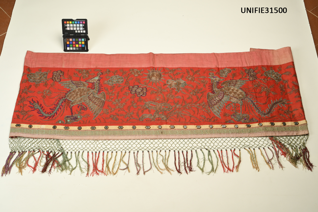 Fascia di seta a fondo rosso, sulla quale si dispone un decoro a ricamo di fili policromi e metallici, con due fenici che si affrontano e con sole, rocce, fiori, melograni, il tutto racchiuso entro cornice in seta gialla (sbiadita), con decoro di specchietti entro cornici in ottone, ulteriore cornice in seta verde e gialla con decoro di caratteri shou (longevità) stilizzati, e ancora fascia superiore in seta rossa molto sbiadita usata anche per foderare il retro, frange sul lato inferiore
