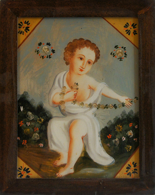 Una cornice di forma rettangolare, delimita il vetro dipinto con la raffigurazione di Gesù Bambino