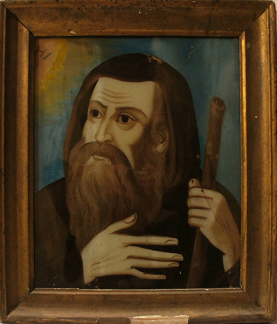 Una cornice di forma rettangolare a foglia dorata, delimita il vetro dipinto con la raffigurazione di San Francesco di Paola