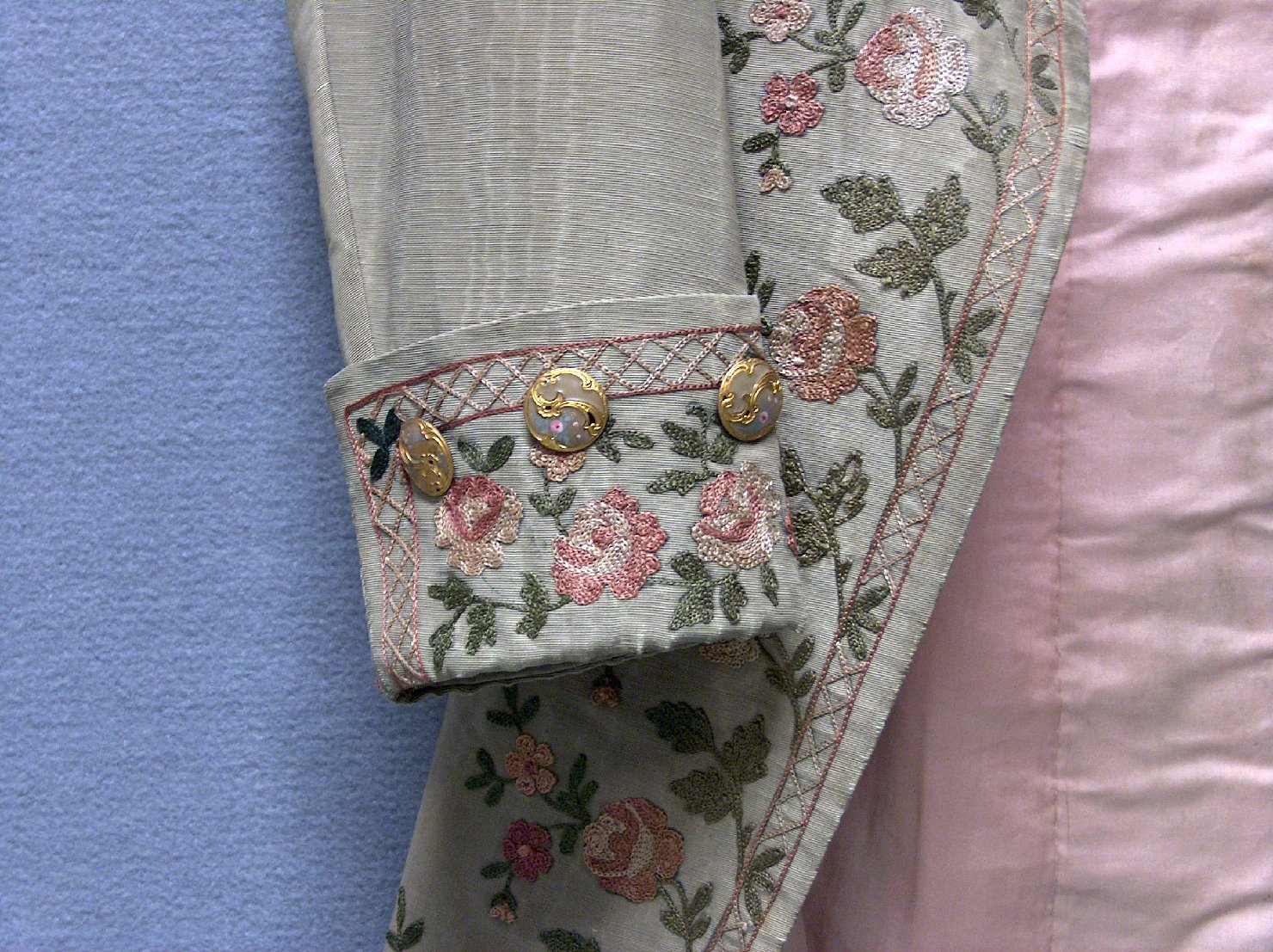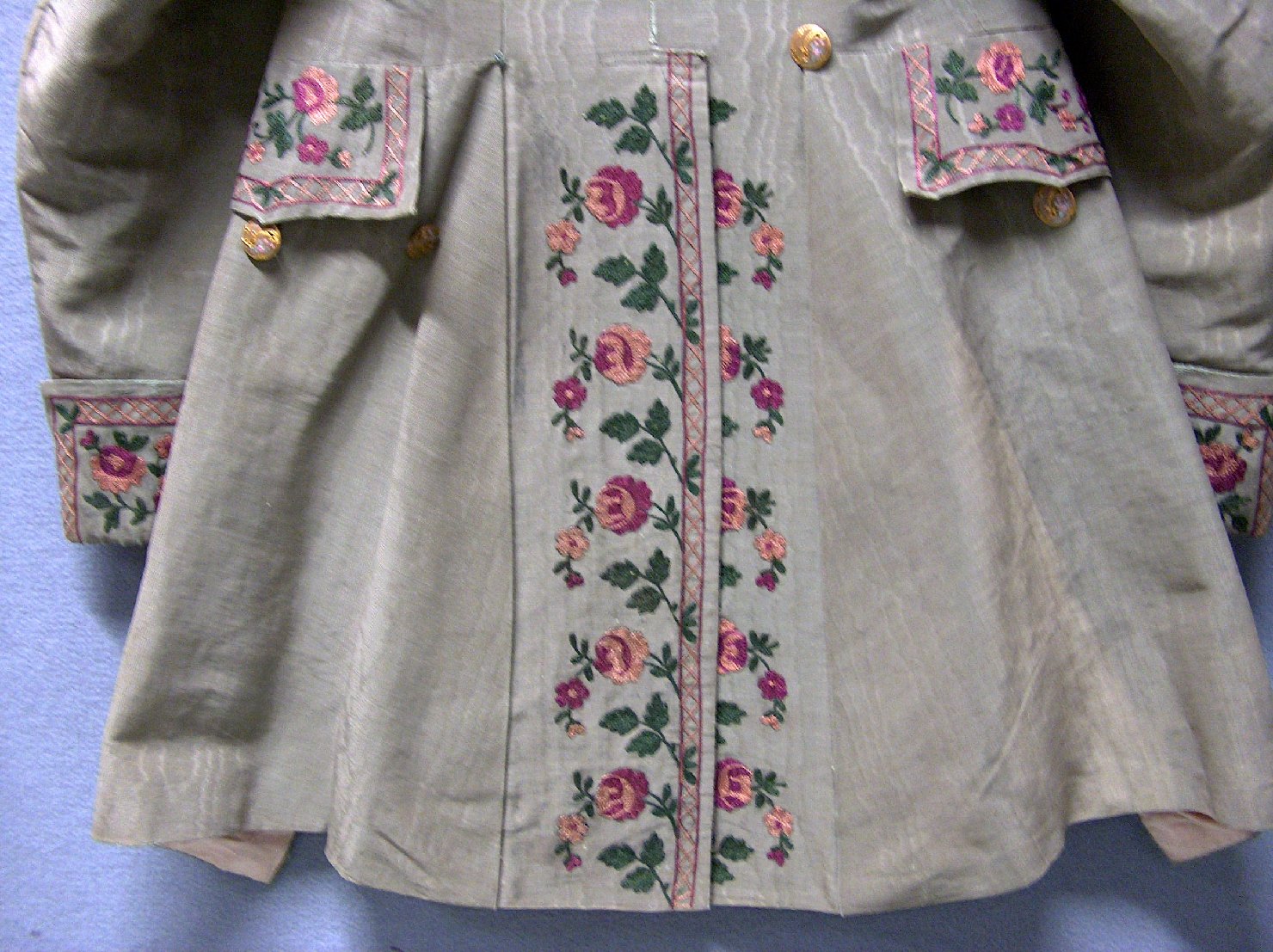 Marsina in shantung di seta color verde foglia con collo "alla coreana" e ricami a motivi fitomorfi verdi e rosa lungo la fascia centrale anteriore e posteriore, nel collo e sui polsini. La finta abbottonatura anteriore, i polsini e la parte sottostante le tasche sono guarniti da bottoni cloisonné in pasta di vetro e metallo dorato, con motivi di piccoli fiori. La fodera interna è in seta rosa