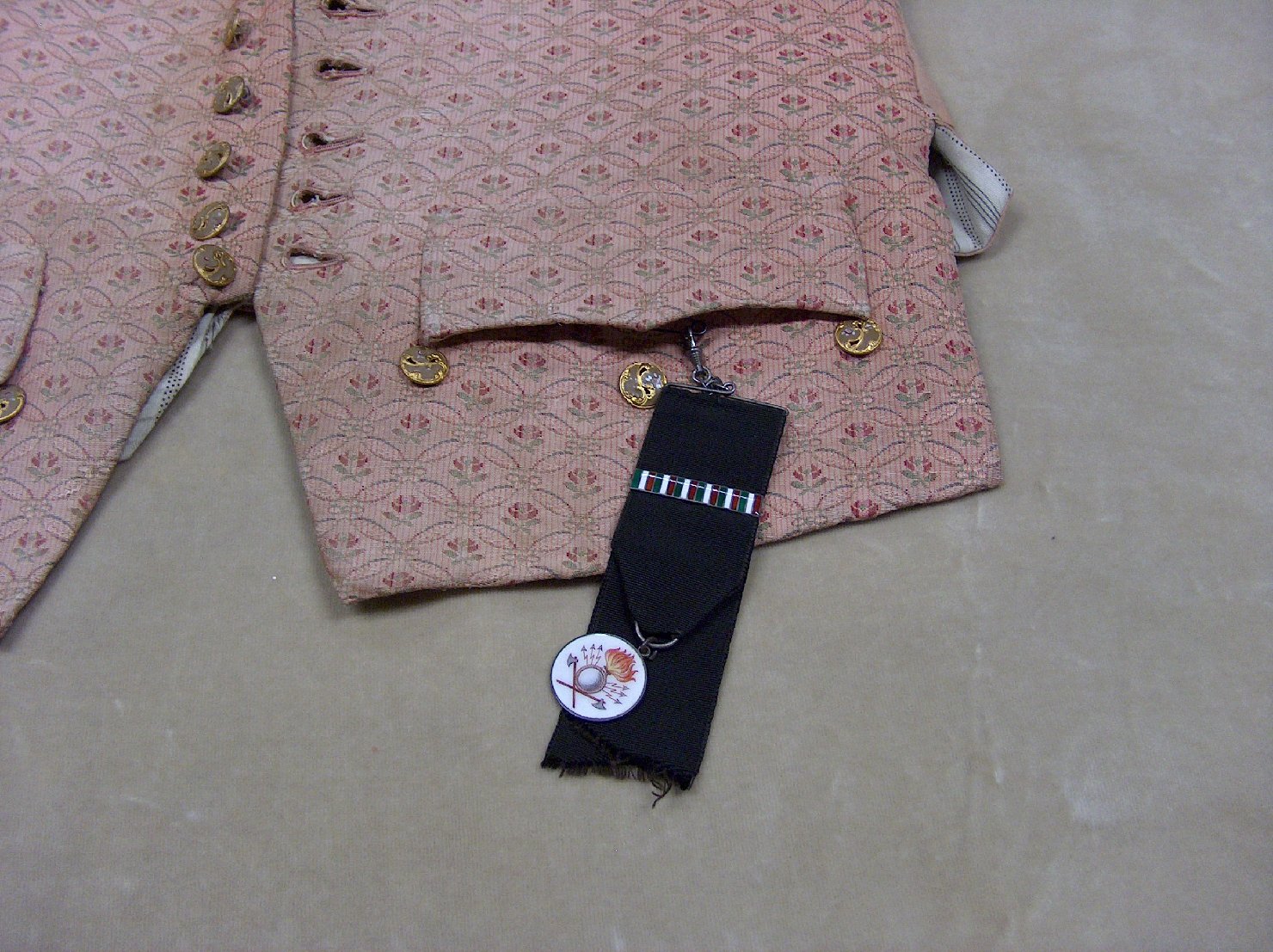 Gilet in tessuto operato a fiorellini verdi e rosa inquadrati da piccoli motivi ellittici, con scollo a V; è chiuso sul davanti da bottoni cloisonné come quelli della giacca ma di più piccole dimensioni, che ornano anche l'area sottostante le tasche. L'interno è foderato in cotone a righine
