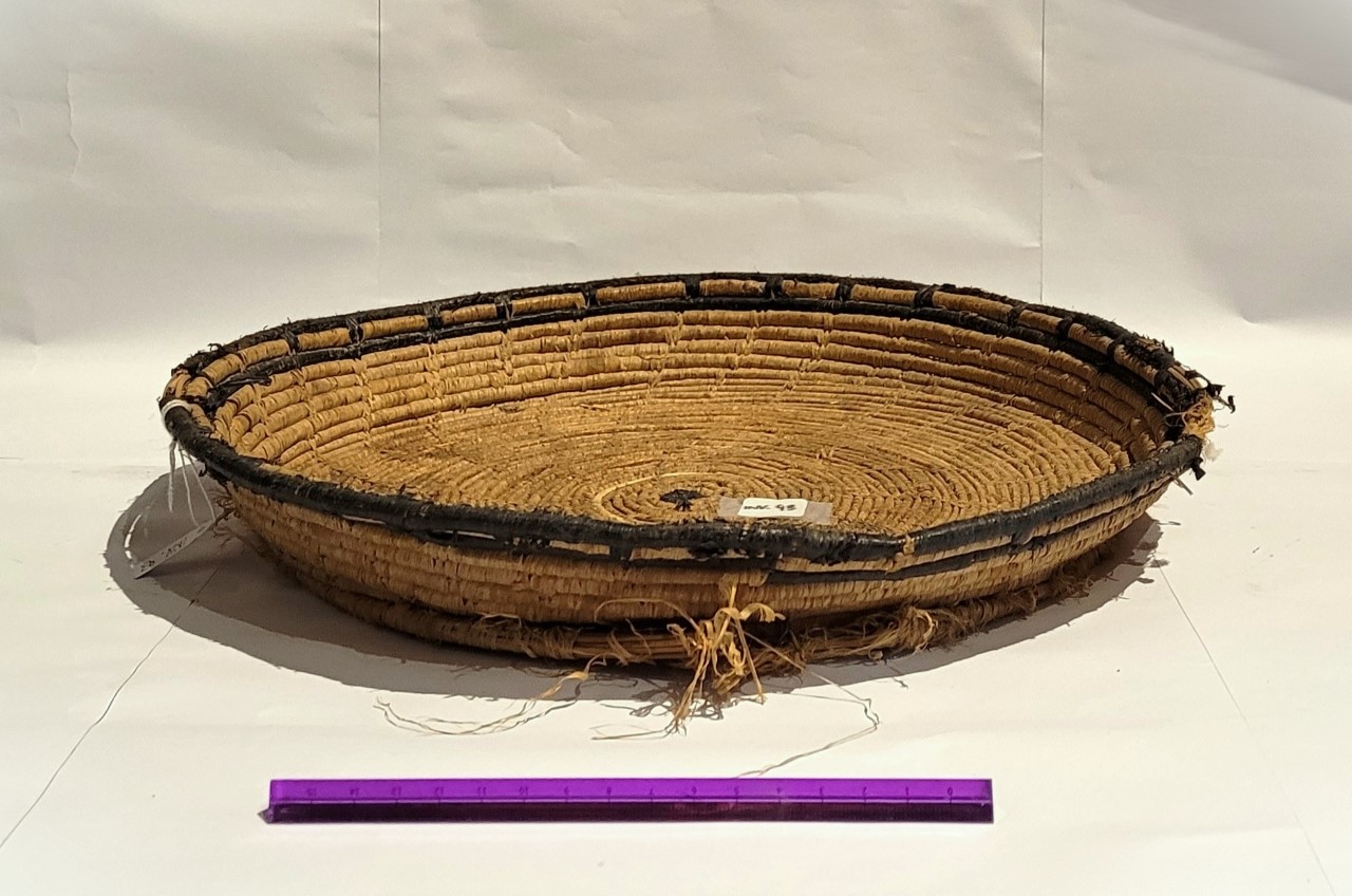 Basso cesto privo di manici di forma vagamente tronco-conica, realizzato con una spirale di fasci di fibre naturali essiccate, di colore naturale, e orlato in base e nei bordi con rafia grezza tinta di nero che, a scopo ornamentale, rimarca le parti terminali