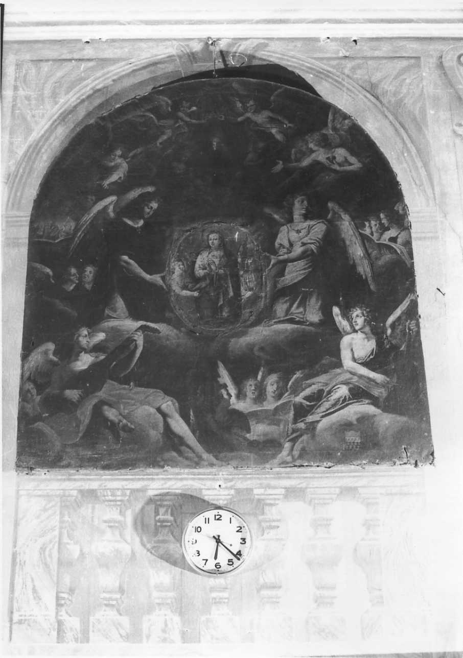 La tela centinata rappresenta due angeli che reggono un medaglione con la Vergine; intorno vi sono angeli in adorazione che suonano e cantano