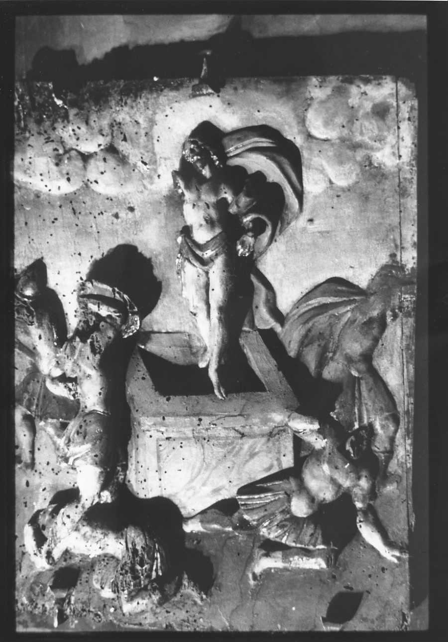 Tavoletta in legno scolpita a rilievo rappresentante la resurrezione di Cristo. La scena pone al centro la figura di Cristo appena risorto dal sepolcro si eleva verso il cielo ricoperto di nubi. Attorno al sarcofago marmoreo stanno i soldati romani, alcuni ancora addormentati, altri che indietreggiano spaventati dell'accaduto