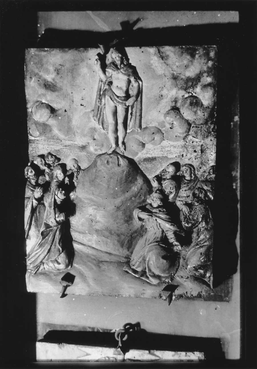 Tavoletta in legno scolpita a rilievo rappresentante l'ascensione di Cristo. Nella parte alta è raffigurato Cristo benedicente con perizoma ed avvolto da un mantello che lascia le proprie impronte sul monte degli Ulivi. In basso ai piedi del monte gli apostoli e la Madonna